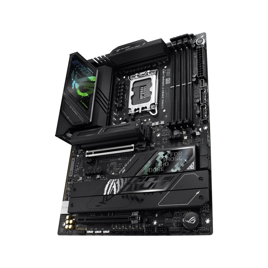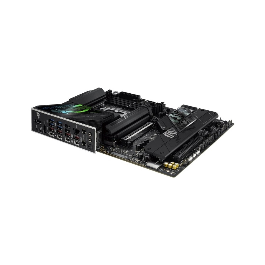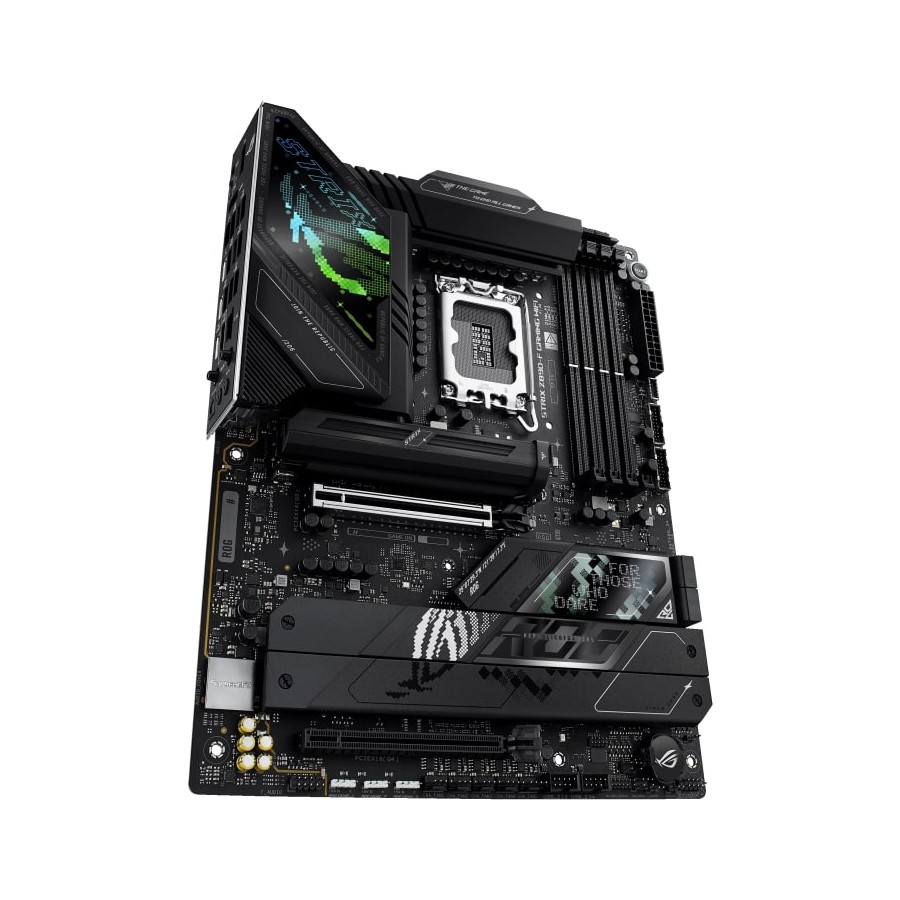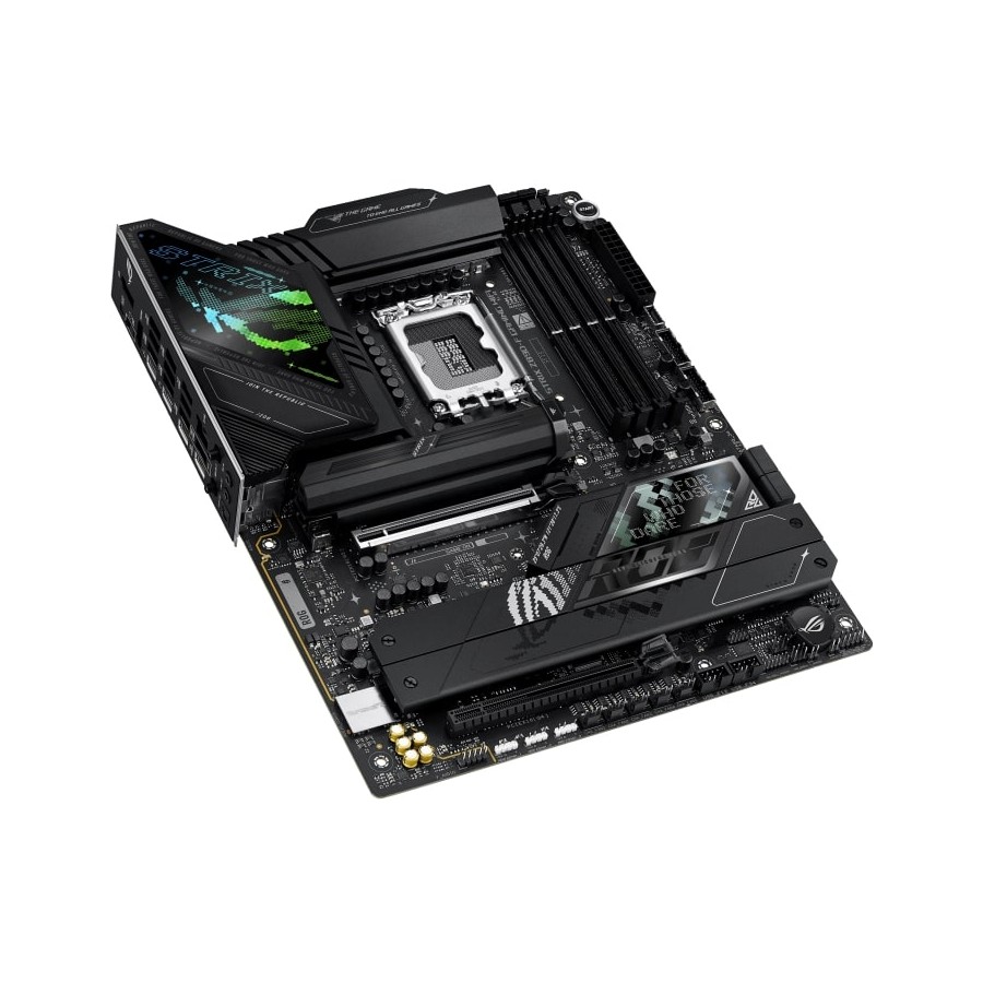 The ROG Strix Z890-F is sleek and understated for seamless integration with a wide range of system components. Its deep black surface and matching metallic heatsinks create a dark, intense look, while the Polymo lighting on the I/O shroud offers customizable RGB effects – so you can choose between a subtle appearance or a bold, eye-catching statement.