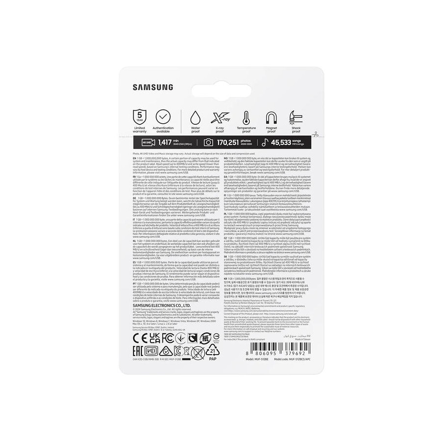 Samsung Bar Plus 512GB – надійний металевий USB-накопичувач у стильному срібному корпусі. Завдяки інтерфейсу USB 3.1 Gen 1 забезпечує швидку передачу даних, відмінно підходить для резервного копіювання, зберігання фото, відео та документів.