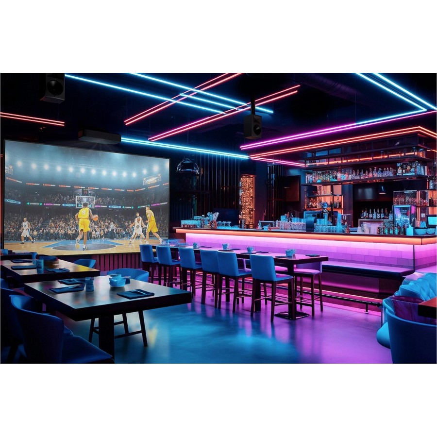 Проєктор Epson EH-QS100B створений для тих, хто хоче отримати величезне 4K-зображення без необхідності монтувати пристрій далеко від стіни. Ультракороткофокусна оптика (коефіцієнт проєкції 0.16) дозволяє виводити зображення діагоналлю понад 100 дюймів, розташувавши проєктор лише за кілька сантиметрів від екрана. Лазерна технологія забезпечує високу яскравість, довговічність та стабільну якість кольору. Цей проєктор підтримує HDR10, має сучасний дизайн та працює майже безшумно, що робить його ідеальним для домашнього кінотеатру у вітальні.