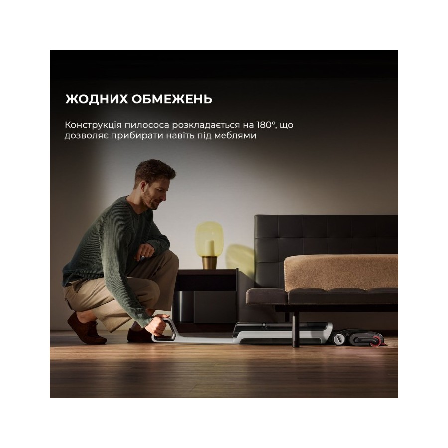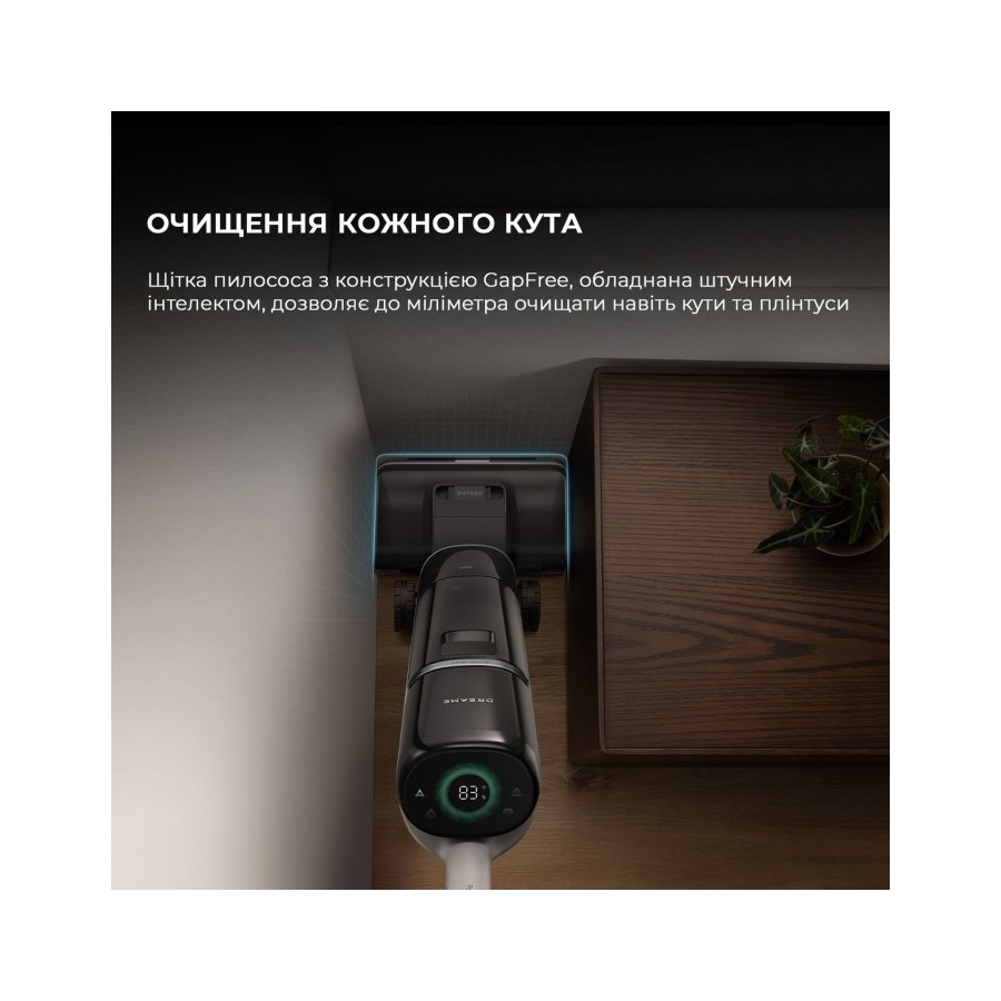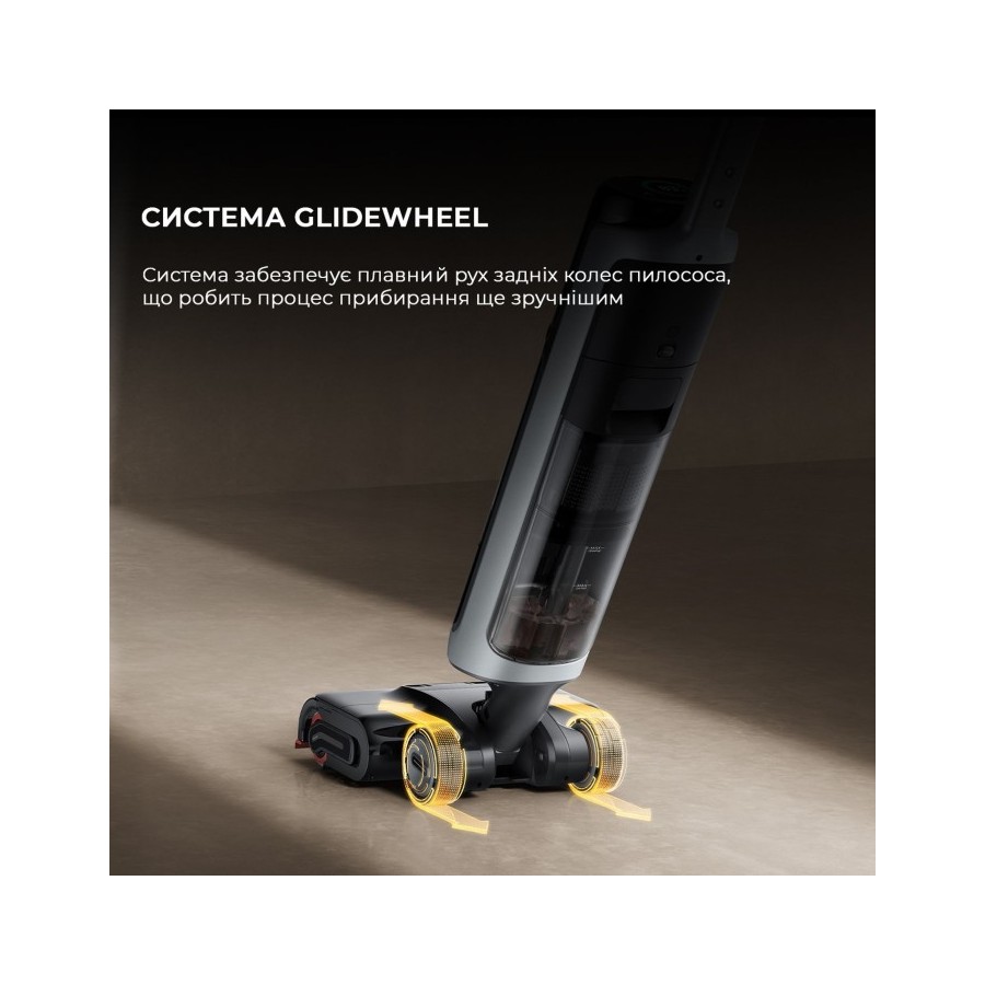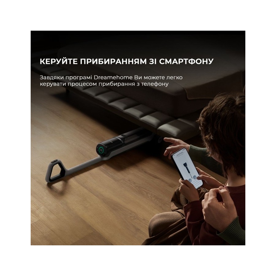 Відчуйте прибирання без допомоги рук за допомогою керування через програму Dreamehome, поклавши пилосос на підлогу та керуючи ним як роботом-пилососом. Направляйте пилосос вперед і назад, а два задніх колеса GlideWheel будуть реагувати та спрямовувати рух пилососу. Він може поміститися у просторах глибиною до 13 см для корпусу та 9,6 см для головки щітки, що робить прибирання у вузьких та низьких просторах більш ефективним та допомагає досягти більш комплексного очищення.
