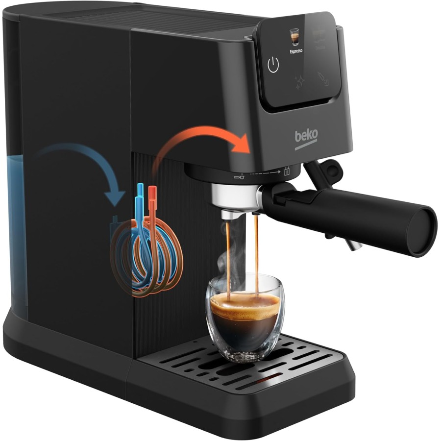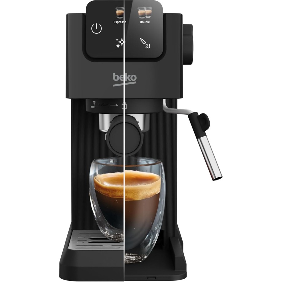 Beko CEP5302B — стильна та функціональна домашня кавоварка, здатна приготувати до двох чашок еспресо чи американо одночасно. 19‑барний насос забезпечує насичений смак, а сенсорний кольоровий дисплей із легкістю дозволяє обирати потрібний режим одним дотиком.