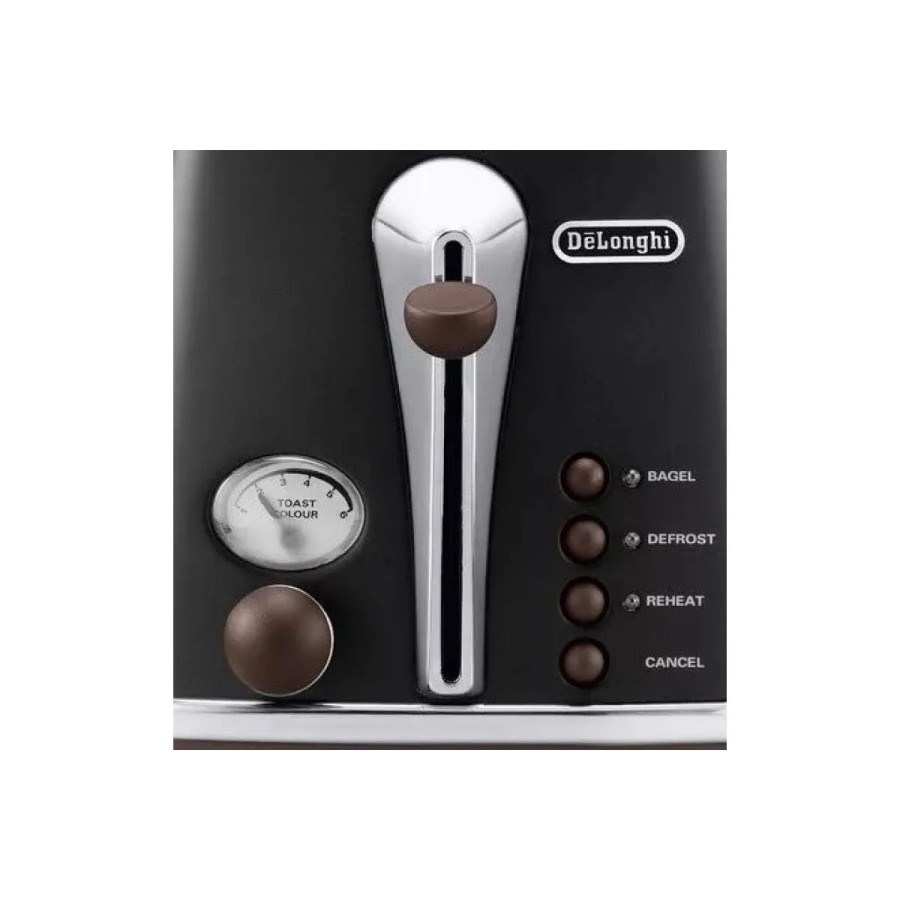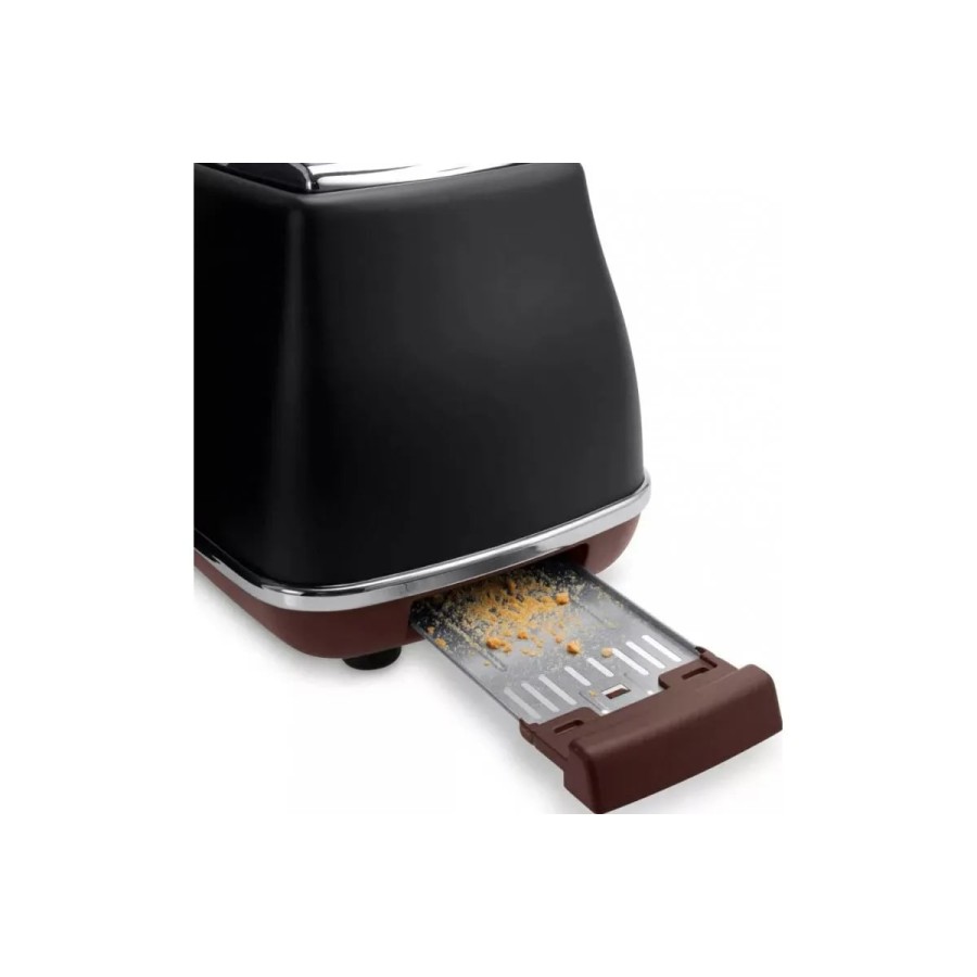 Зручна знімна крихтозбірна піддон дозволяє легко утримувати прилад у чистоті. Корпус виготовлений із металу з матовим покриттям у глибокому чорному кольорі — це підкреслює вінтажний стиль і робить його родзинкою кухні. Гумові ніжки забезпечують стійкість, а класичний важіль дозволяє легко виймати тости. Тостер DeLonghi Icona Vintage — це ідеальний вибір для тих, хто цінує красу та функціональність у побуті.