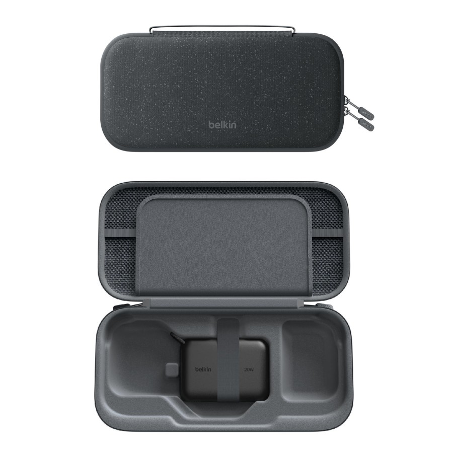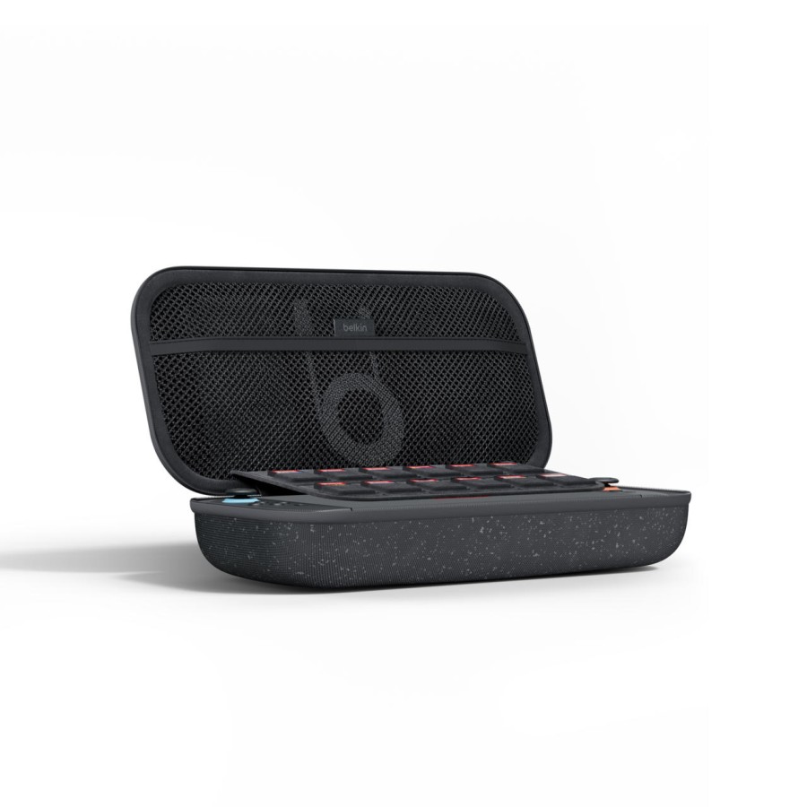 Мобільне живлення без компромісів. Усередині – потужний акумулятор 10 000 мА·год із дисплеєм, який дає змогу відновлювати заряд Nintendo Switch 2 до 1,5 раза швидше. Забезпечено живлення 20 Вт через розніми USB-C та USB-A. Завдяки технології Belkin SmartProtect заряджання безпечне та стабільне, навіть коли гра триває. Спеціальна канавка для підставки дає змогу встановити консоль безпосередньо в кейсі, щоби грати й одночасно заряджати.