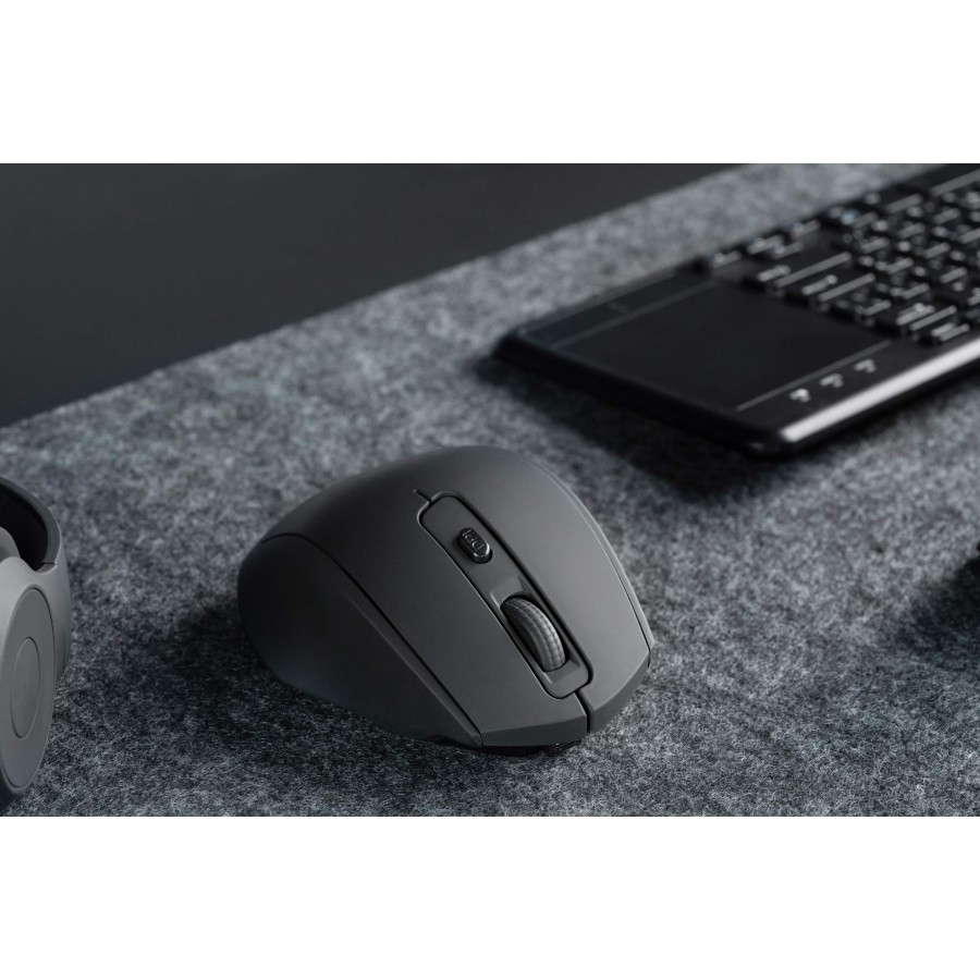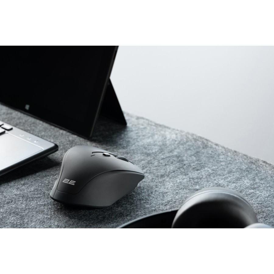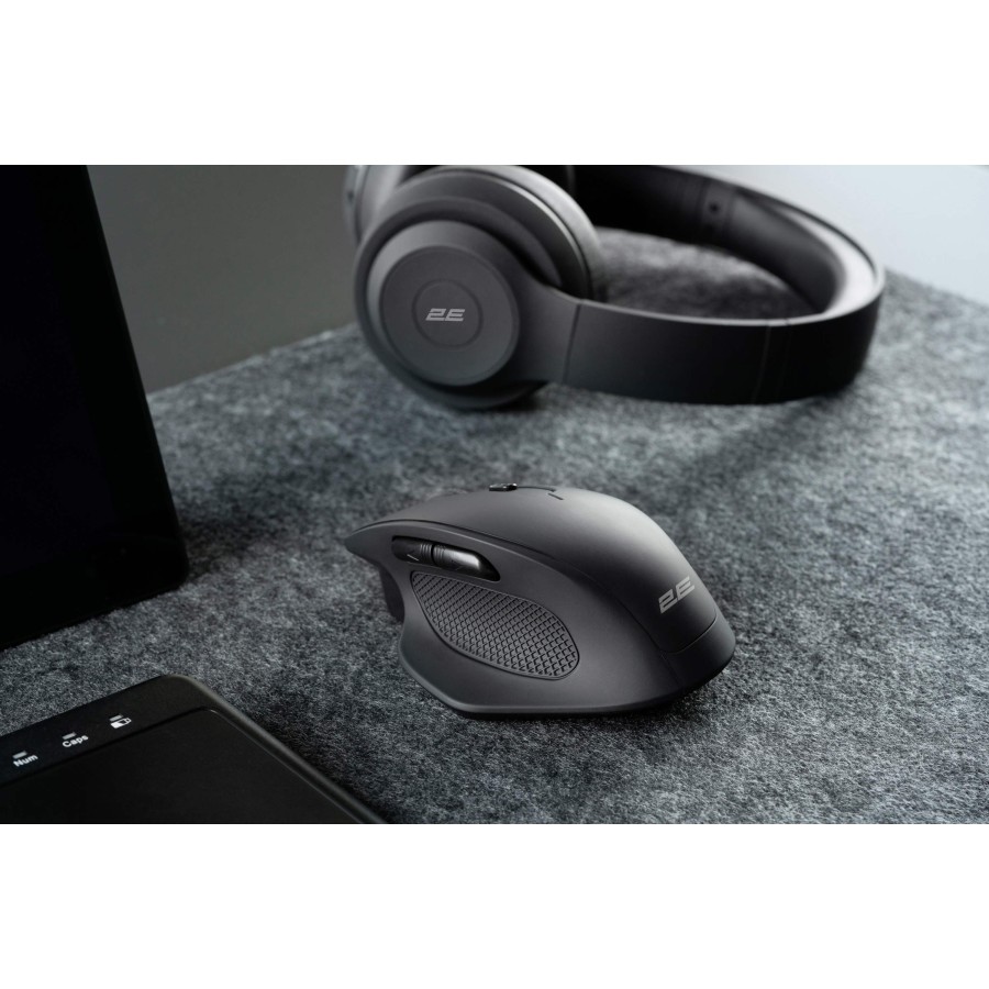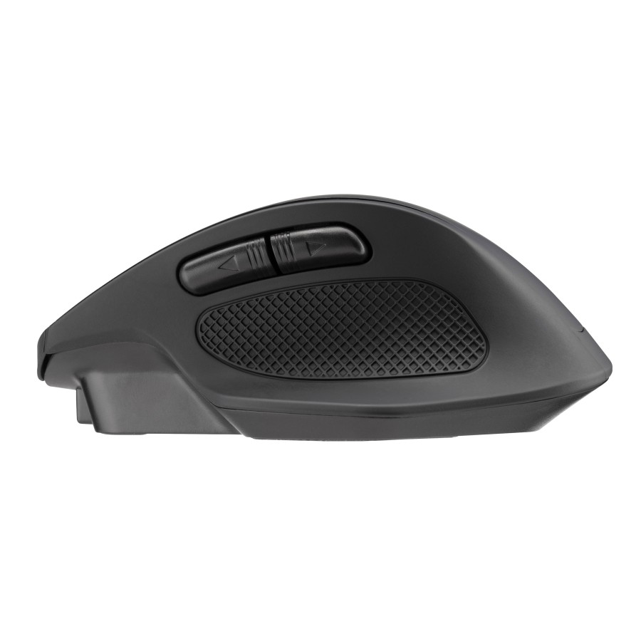 Повнорозмірна велика миша анатомічної форми виконана в чорному стриманому дизайні та повністю вкрита приємним на дотик Soft Touch покриттям, що є запорукою омфортної роботи. Додаткова підставка під великий палечь, з фактурною вставкою, роблять мишку максимально зручною для тривалого використання. Вбудована літій-полімерна батарея забезпечить до 60 днів* роботи, при повній зарядці, а при необхідності зярядки мишкою з легкістю можна користуватися в дротовому режимі, підключивши до ПК для підзарядки.