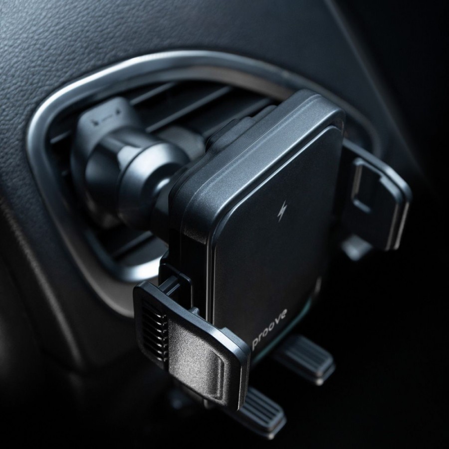 Підтримує стандарт Qi для бездротової зарядки з потужністю до 15W, тож під час поїздки телефон не лише фіксується, а й автоматично заряджається. Заряджає навіть через чохол завтовшки до 4 мм. Є окрема кнопка для ввімкнення та вимкнення функції бездротової зарядки, що дозволяє використовувати тримач у зручному режимі. Працює від входу Type‑C, сумісного з сучасними зарядними аксесуарами.