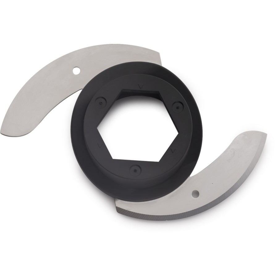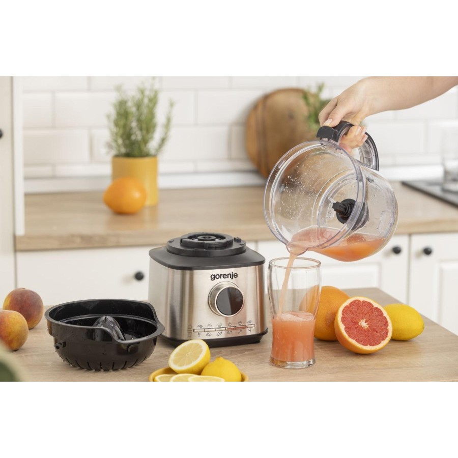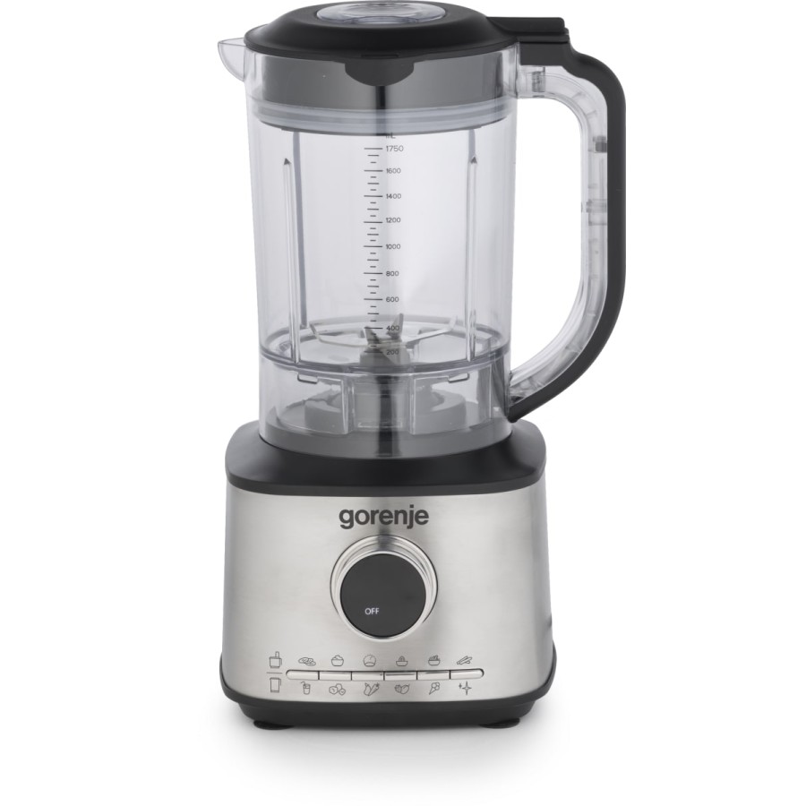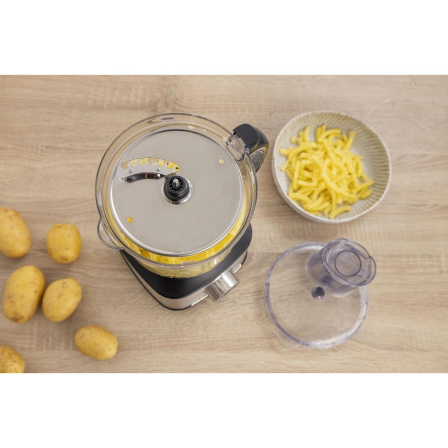 Комплектація створена як Total Food Prep Solution: чаша 2,0 л для замішування та збивання, глечик блендера 1,75 л (із 6-точковим ножем) і спортивний шейкер 700 мл для напоїв «із собою». У наборі — подвійний універсальний ніж із нержавіючої сталі для рубання/змішування/пюре, пластикова насадка для тіста, насадка для збивання білків, соковидавлювач для цитрусових і набір різальних дисків (нарізання скибками, шаткування, натирання — у т. ч. дрібне).
