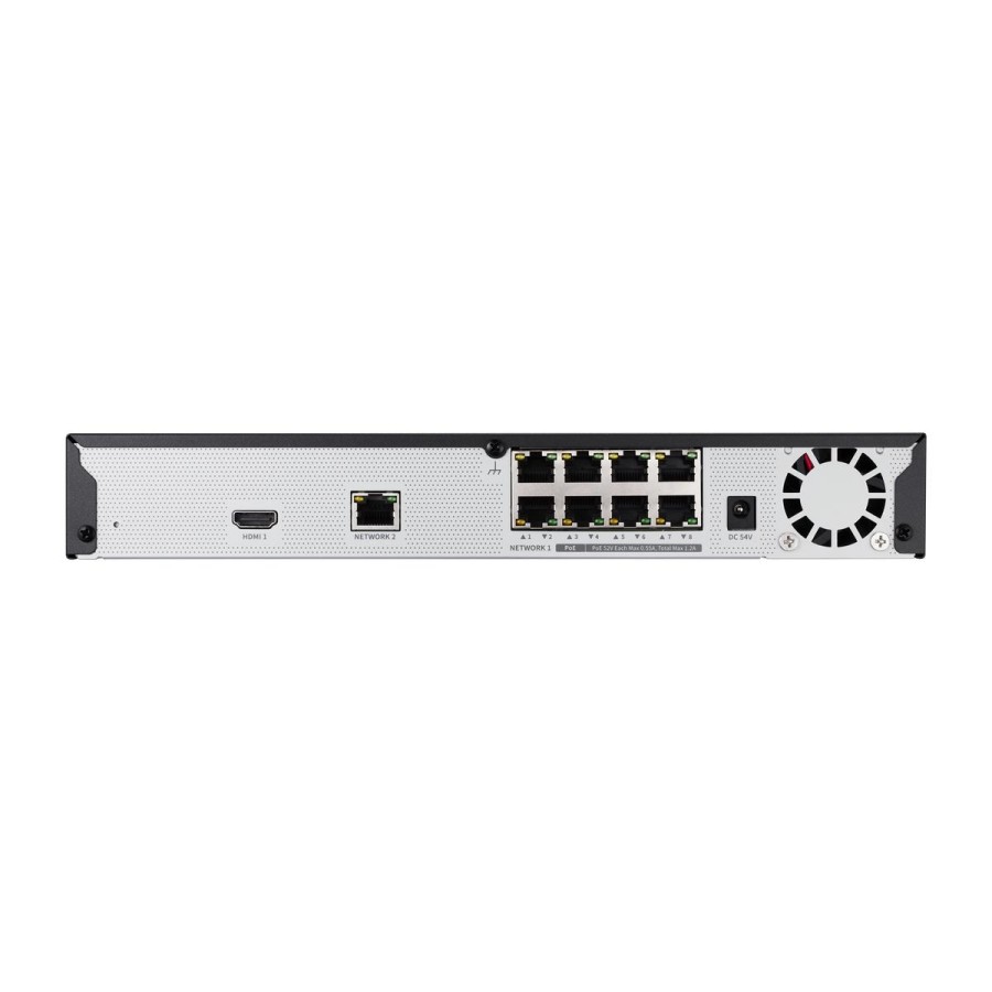Реєстратор забезпечує запис із пропускною здатністю до 80 Мбіт/с. Вісім вбудованих PoE-портів (LAN, 10/100) і один гігабітний PoE-порт (WAN, 1Gbps) дозволяють підключати камери за принципом Plug & Play, скорочуючи час інсталяції та спрощуючи конфігурацію.