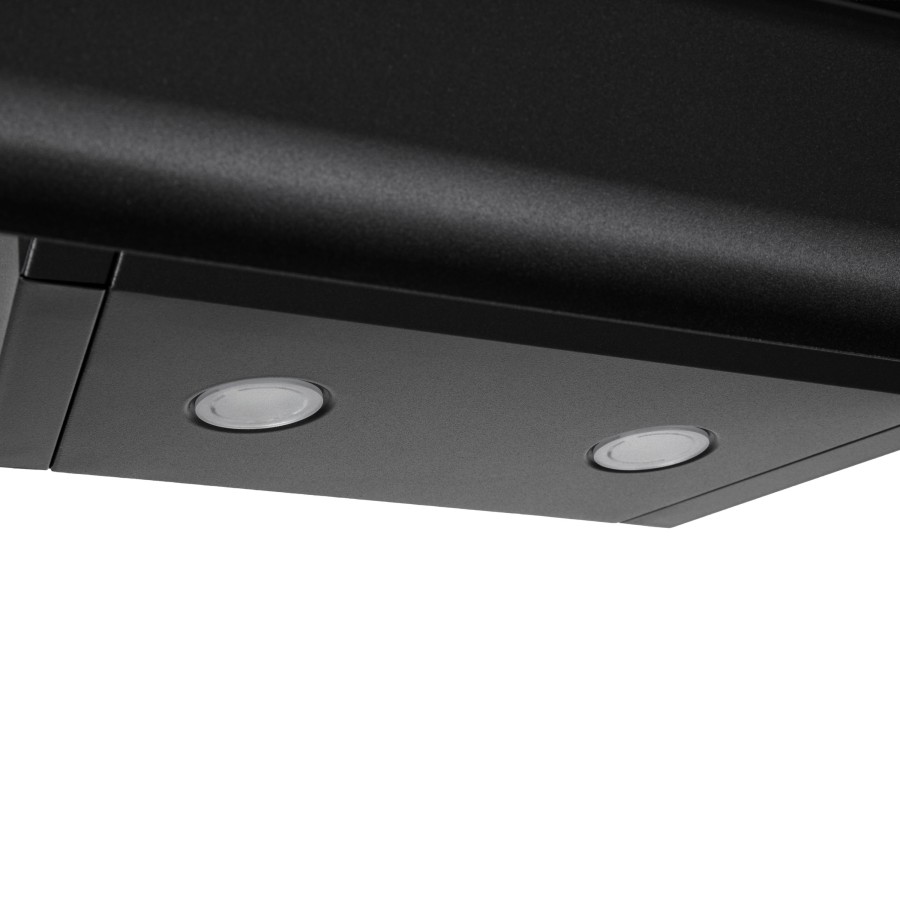 Тришаровий алюмінієвий фільтр ефективно вловлює жир, а заслінка перешкоджає зворотному потоку повітря. Рівень шуму під час роботи становить до 66 дБ. Дві LED-лампи потужністю 1 Вт кожна забезпечують рівномірне підсвічування робочої поверхні, навіть за слабкого основного освітлення. Скляна та металева частини корпусу вирізняються високою зносостійкістю до механічних пошкоджень і перепадів температур.