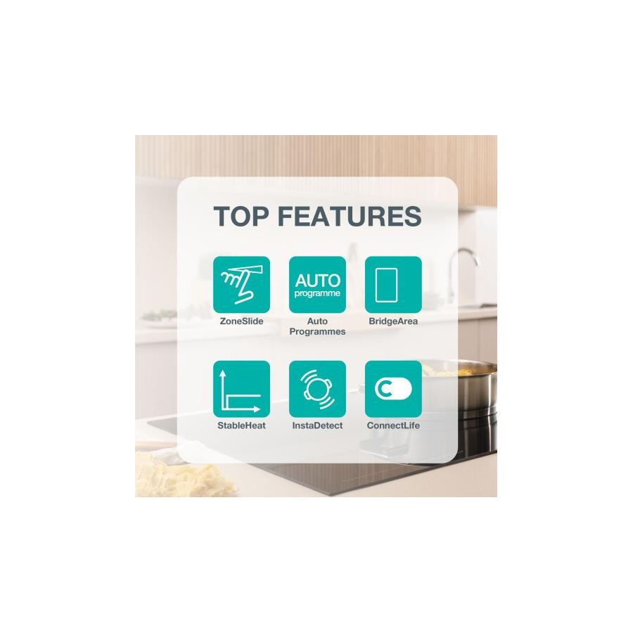 Функція PowerBoost забезпечує надпотужний нагрів, значно скорочуючи час закипання води чи розігріву їжі. Сенсорне управління SliderTouch дозволяє інтуїтивно та точно вибирати рівень потужності простим ковзанням пальця. Поверхня легко чиститься завдяки гладкому склу, яке не нагрівається так сильно, як традиційні конфорки — пролита рідина не пригорає.
