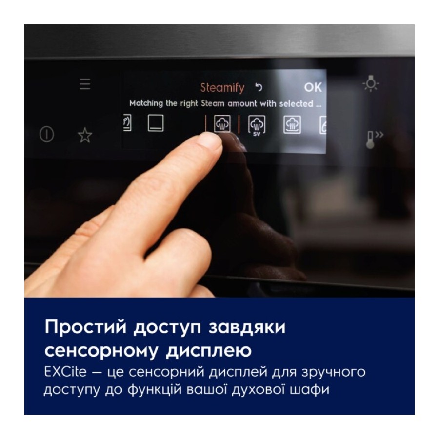 EXCite — це чутливий сенсорний TFT-дисплей, який забезпечує інтуїтивний доступ до функцій вашої духової шафи. Він надає необхідний миттєвий зворотній зв'язок, забезпечуючи повний контроль над процесом готування відповідно до рецепту.