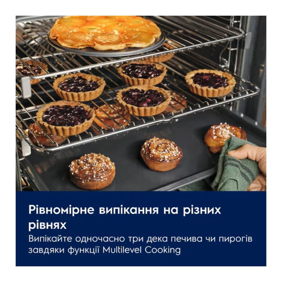 Функція багаторівневого готування активує третій нагрівальний елемент, даючи змогу випікати страви на декількох рівнях. Ідеально підходить для використання відразу трьох дек із печивом чи пиріжками.