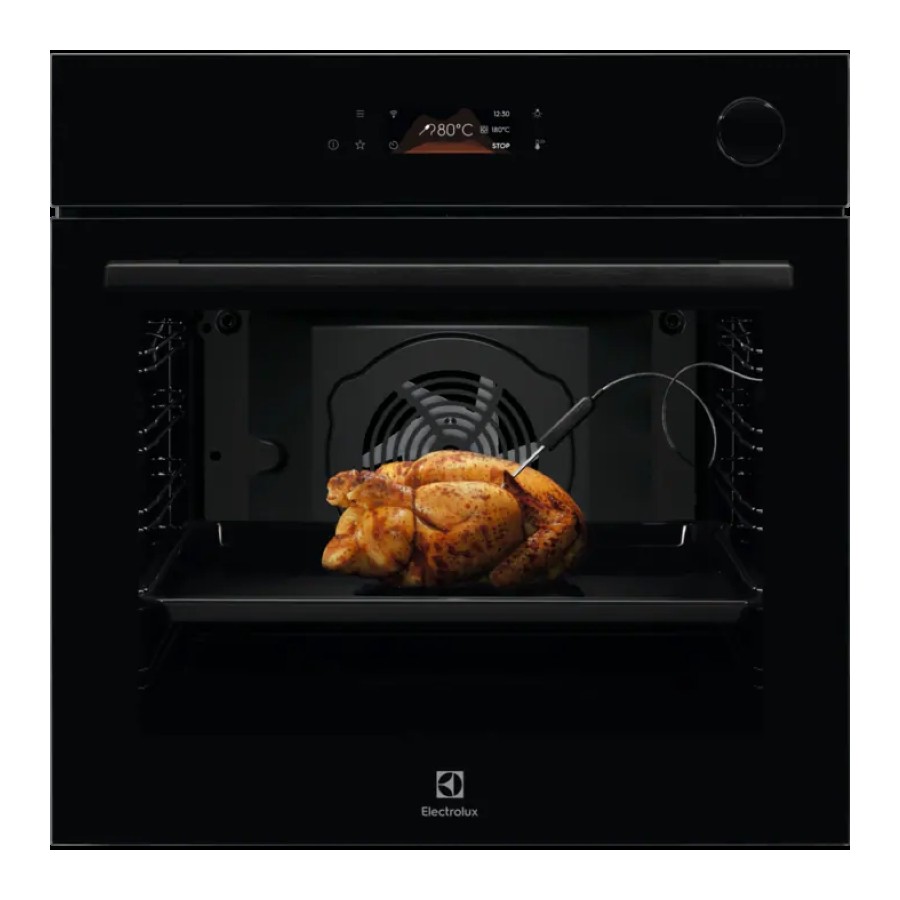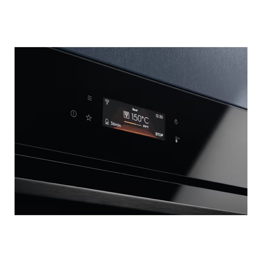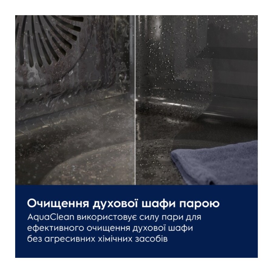 Для прибирання достатньо налити воду на дно й увімкнути AquaClean — пара розм’якшує жир і залишки їжі, а емаль Aqua Clean полегшує видалення забруднень. Духова має 3 рівні приготування, швидкий нагрів, електронне регулювання температури, автоматичну рекомендацію температури, пам’ять часто використовуваних налаштувань, функцію продовження часу приготування, індикатор залишкового тепла та захист від доступу дітей. Через застосунок Electrolux доступні віддалене керування, підказки та рецептурна підтримка.