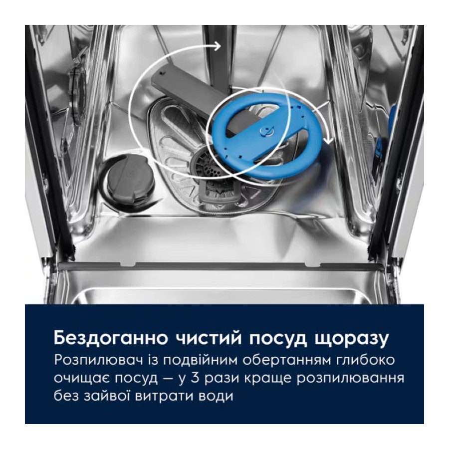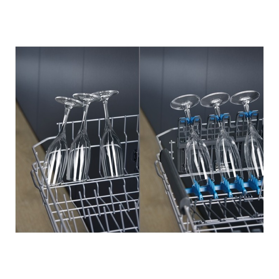 Вбудована посудомийна машина Electrolux KEMB3301L поєднує делікатне поводження зі склом і високу результативність миття повсякденного посуду. Верхня полиця системи 700 GlassCare оснащена SoftGrips і SoftSpikes — м’які елементи фіксують тонкостінні келихи й запобігають мікроподряпинам і сколам, тож ручне миття крихких виробів більше не потрібне. Розпилювач SatelliteClean із подвійним обертанням постійно змінює кут подачі води, забезпечуючи рівномірне омивання навіть щільно розставленого посуду.