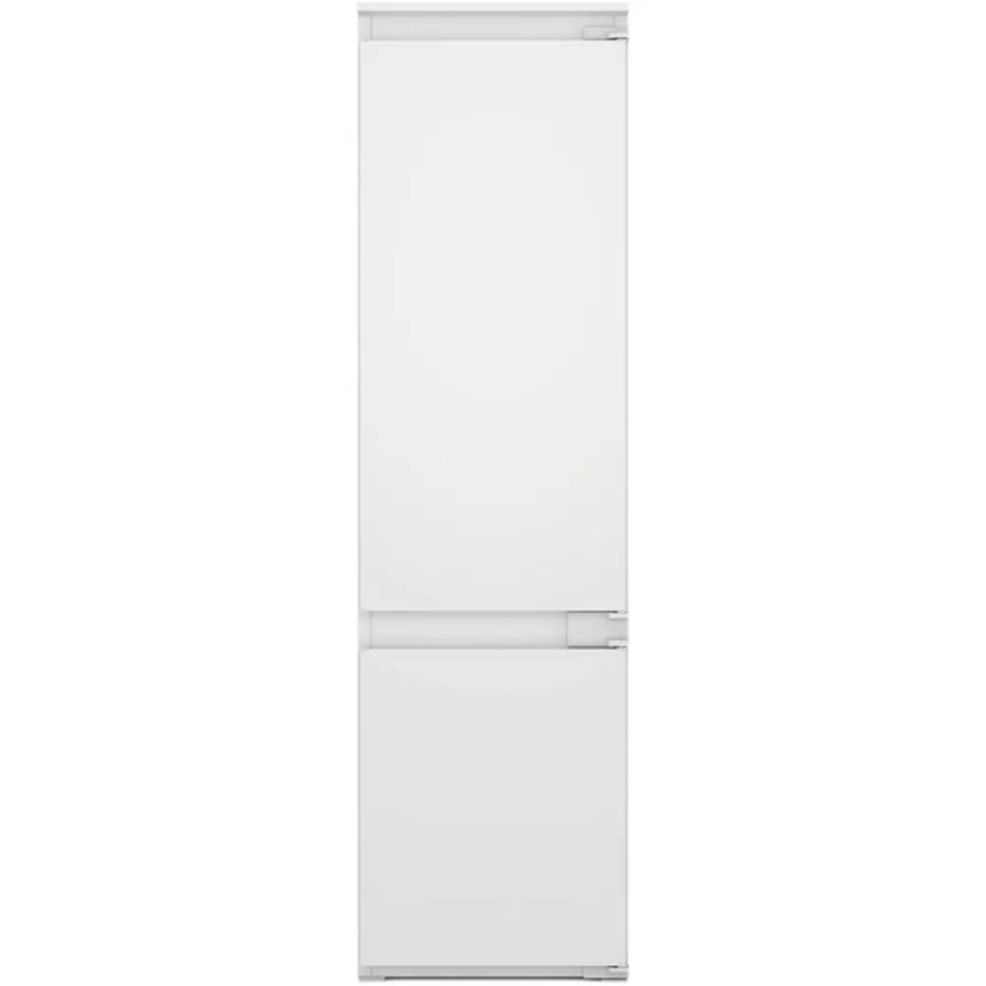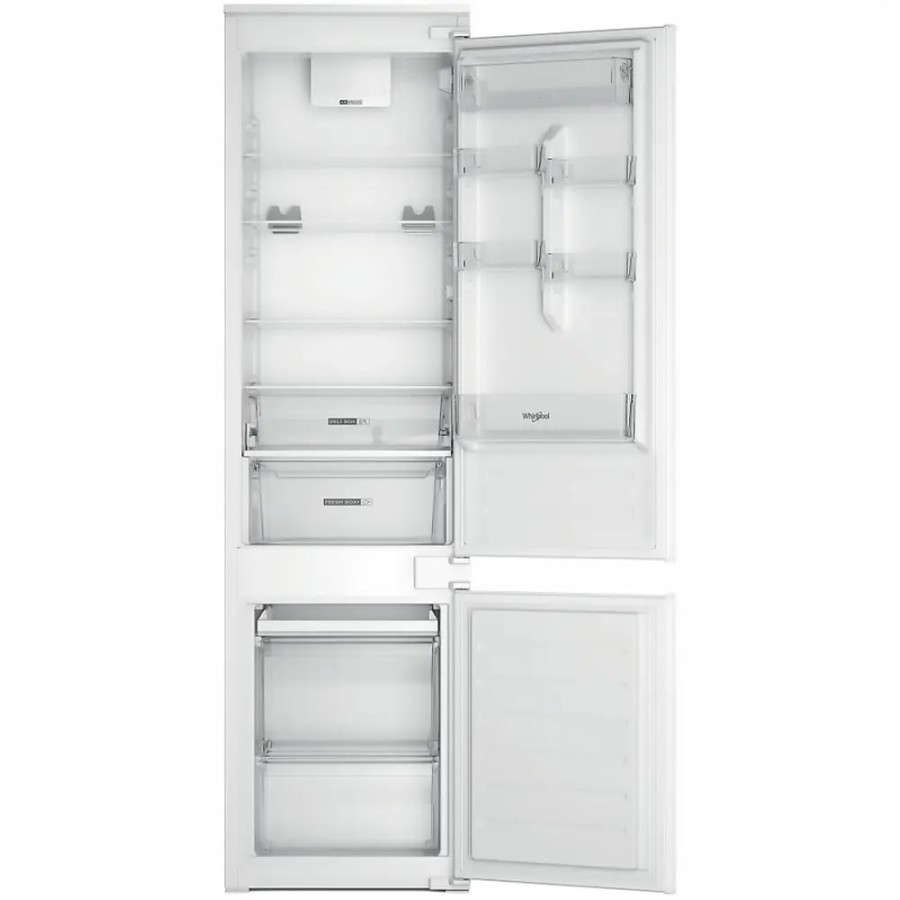 Вбудований двокамерний холодильник у білому кольорі, розміри 193,5x54x54,5 см (ніша 194x56x56 см). Перевішування дверей для гнучкого розміщення. Функції швидкого охолодження, сигналу відкритих дверей і регульованих полиць.