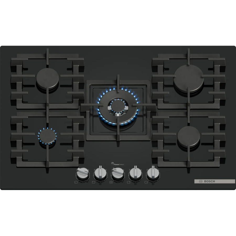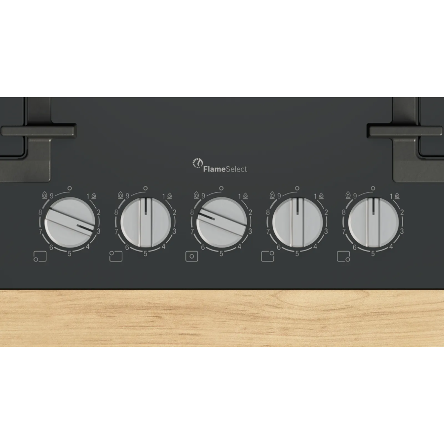 Bosch PPQ7A6I45 — газова варильна поверхня на загартованому чорному склі шириною 75 см із безрамковим дизайном і можливістю монтажу врівень або накладного монтажу. П’ять конфорок охоплюють широкий діапазон сценаріїв: центральна WOK до 4 кВт, швидка 3 кВт, дві стандартні по 1,75 кВт і економічна 1 кВт (залежно від типу газу). Технологія FlameSelect пропонує дев’ять фіксованих рівнів полум’я, а автоматичне електрозапалювання інтегроване у ручки для запуску натисканням і поворотом. Окремі чавунні решітки легкі в догляді та придатні для миття в посудомийній машині, зона навколо перемикачів спроєктована для швидкого очищення. За безпеку відповідає термоелектричний захист, що перекриває газ у разі згасання полум’я. Прилад постачається із заводським налаштуванням на природний газ 20 мбар. У комплекті є форсунки для зрідженого газу 28–30/37 мбар, інші комплекти форсунок доступні через сервіс. До комплекту входить хрестоподібна підставка для турки.
