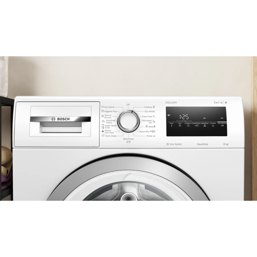 Зручність щоденного користування підсилюють функція дозавантаження — можна додати забуту річ під час циклу, сенсорні кнопки TouchControl, акустичний сигнал завершення, блокування від дітей та лічильник завершених програм. AquaStop забезпечує 100% захист від протікань протягом усього строку служби — подвійний шланг, запобіжний клапан і поплавковий датчик перекриють воду навіть у разі пошкодження. Про стан приладу подбає й програма очищення барабана з автоматичним нагадуванням після приблизно 20 циклів при 40 °C.