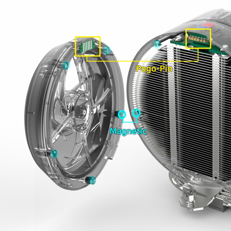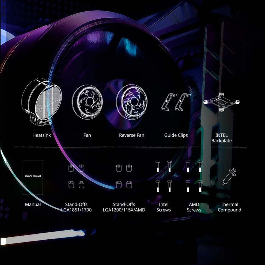- радіатор баштового типу висотою 158 мм (у тому числі теплові трубки) та незвичайною конструкцією для активного тепловідведення, за сумісними параметрами з більшістю сучасних корпусів;