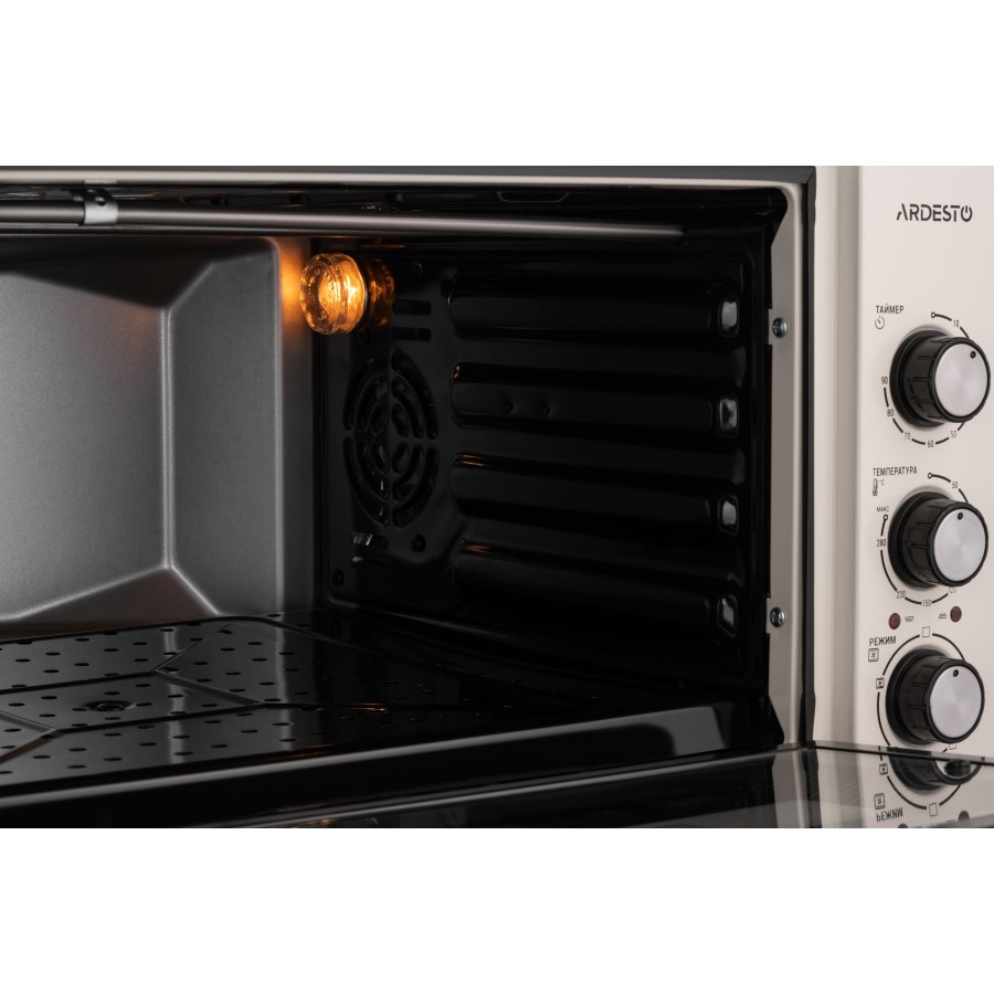 Модель вирізняється потужністю (1 600 Вт), збільшеним об’ємом внутрішньої камери (50 л) та покращеною термоізоляцією – дверцята мають подвійне загартоване скло, що особливо актуально для родин із дітьми, тож можна не турбуватися щодо безпеки рук у разі, якщо малеча випадково вхопиться за пристрій. Для зручності використання передбачено внутрішнє освітлення камери та ніжки з протиковзким покриттям для надійного зчеплення з поверхнею.