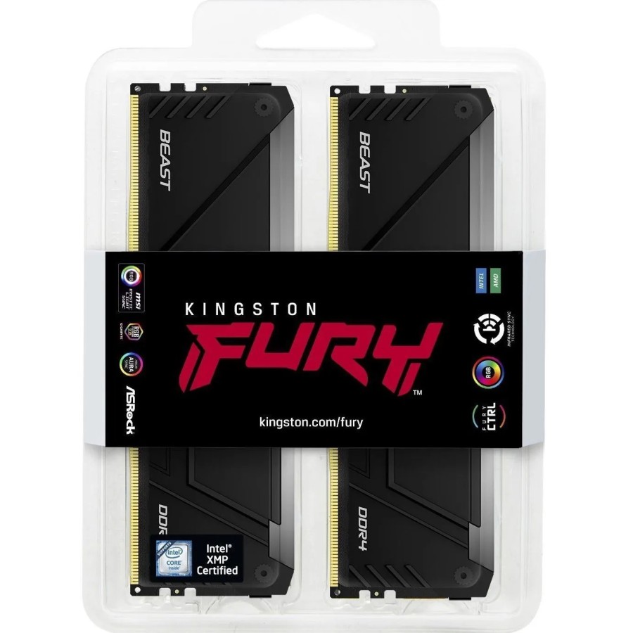 Комплект оперативної пам’яті Kingston FURY Beast RGB DDR4 16 ГБ (2x8 ГБ) виконано у форм-факторі DIMM із 288-контактними позолоченими роз’ємами для надійного підключення. Кожен модуль базується на восьми 1G x 8-бітних компонентах FBGA, що забезпечує компактність і ефективну інтеграцію в системи. Стильне RGB-підсвітлення додає естетичності, а радіатор охолодження підтримує стабільну роботу під навантаженнями. Таймінги 16-18-18 з латентністю CL16 на частоті 3200 МГц та напрузі 1,35 В оптимізують швидкість обміну даними, а підтримка Intel XMP 2.0 полегшує автоматичне налаштування. Конструкція відповідає JEDEC стандарту з базовими таймінгами 17-17-17 на 1,2 В, гарантуючи сумісність із різними платформами, а висота модулів зручно вписується в типові корпуси.