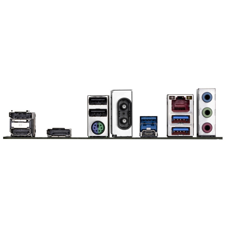 Плата пропонує сучасний набір інтерфейсів: два DisplayPort і HDMI для під’єднання кількох моніторів, численні USB-порти для периферії, а також посилений слот PCIe x16 із технологією EZ-Latch для швидкого встановлення та зняття відеокарти.