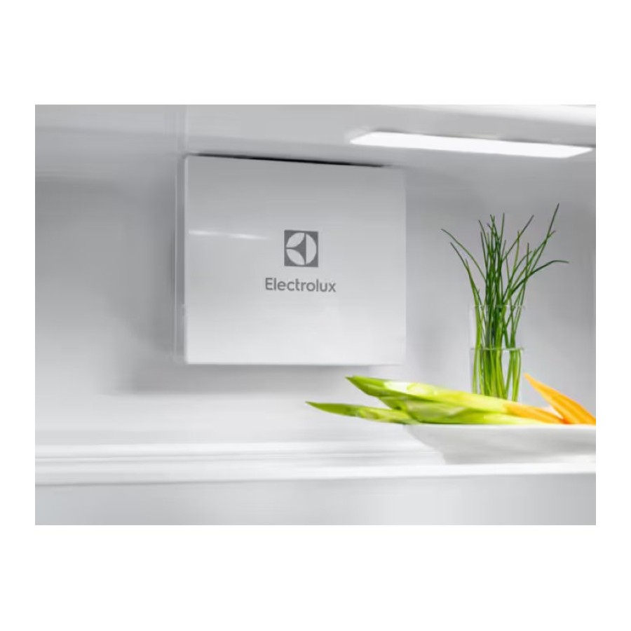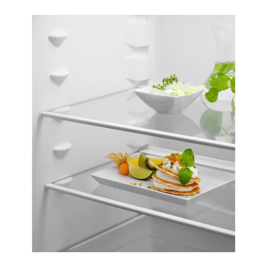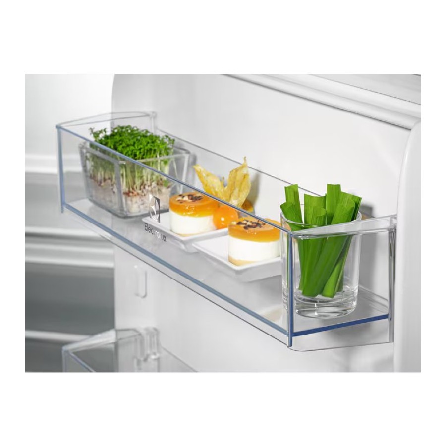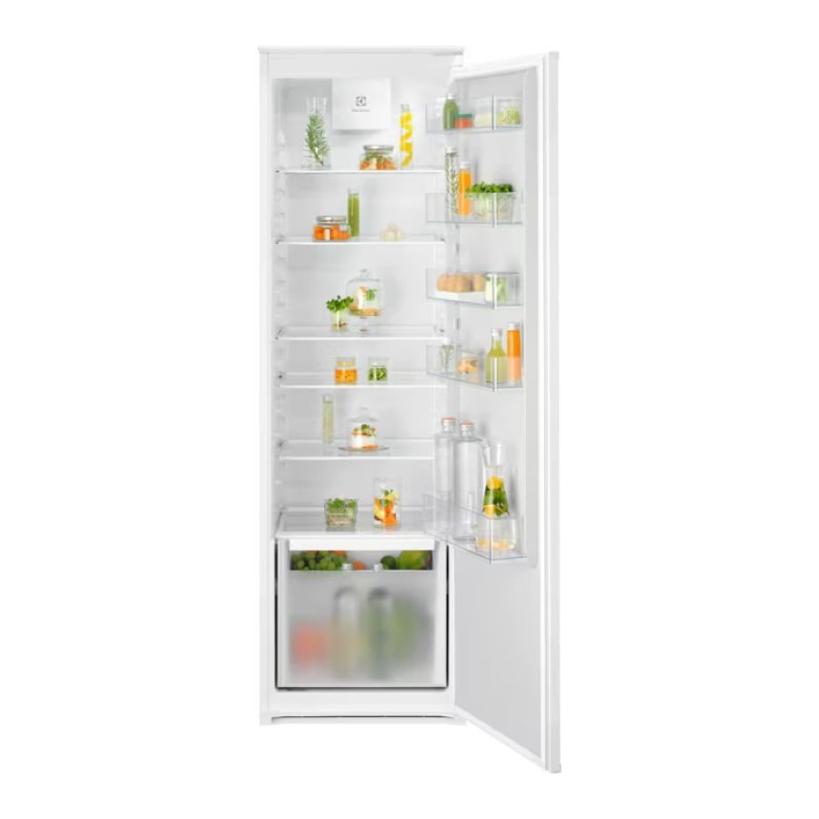 Вбудований однокамерний холодильник Electrolux створений для повністю інтегрованого монтажу з розсувним фасадом і працює як окрема холодильна камера без морозильного відділення. Корисний об’єм 310 л забезпечує простір для щоденних запасів продуктів родини. Усередині розміщені п’ять полиць повної ширини та велика висувна шухляда, що дає змогу зручно розкладати овочі, фрукти, напої та готові страви і швидко знаходити потрібні продукти.