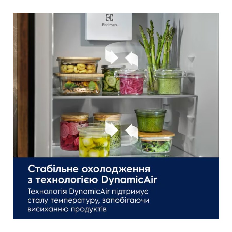 Технологія DynamicAir створює всередині камери інтенсивний повітряний потік, який переміщує холодне повітря по всьому простору та підтримує стабільну температуру в кожному куточку. Завдяки цьому продукти не пересихають і не втрачають форму, а ризик локального нагрівання зменшується навіть під час частого відкривання дверцят. Для швидкого зниження температури після завантаження нових продуктів використовується функція Action Cool, яка допомагає оперативно повернути оптимальний температурний режим.
