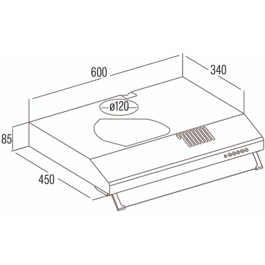 LED-освітлення економно підсвічує робочу зону. Витяжка працює в режимі відведення або рециркуляції (з вугільним фільтром, який купується окремо). Діаметр виходу 120 мм, мінімальна відстань до плити 650 мм. Клас енергоефективності B, низьке споживання енергії.