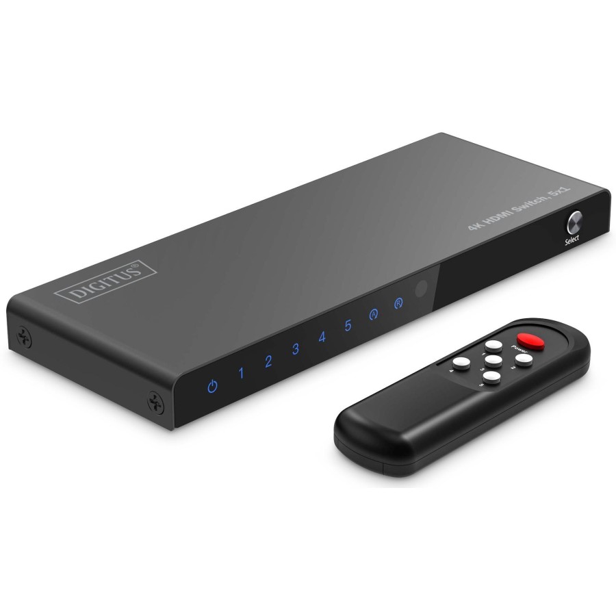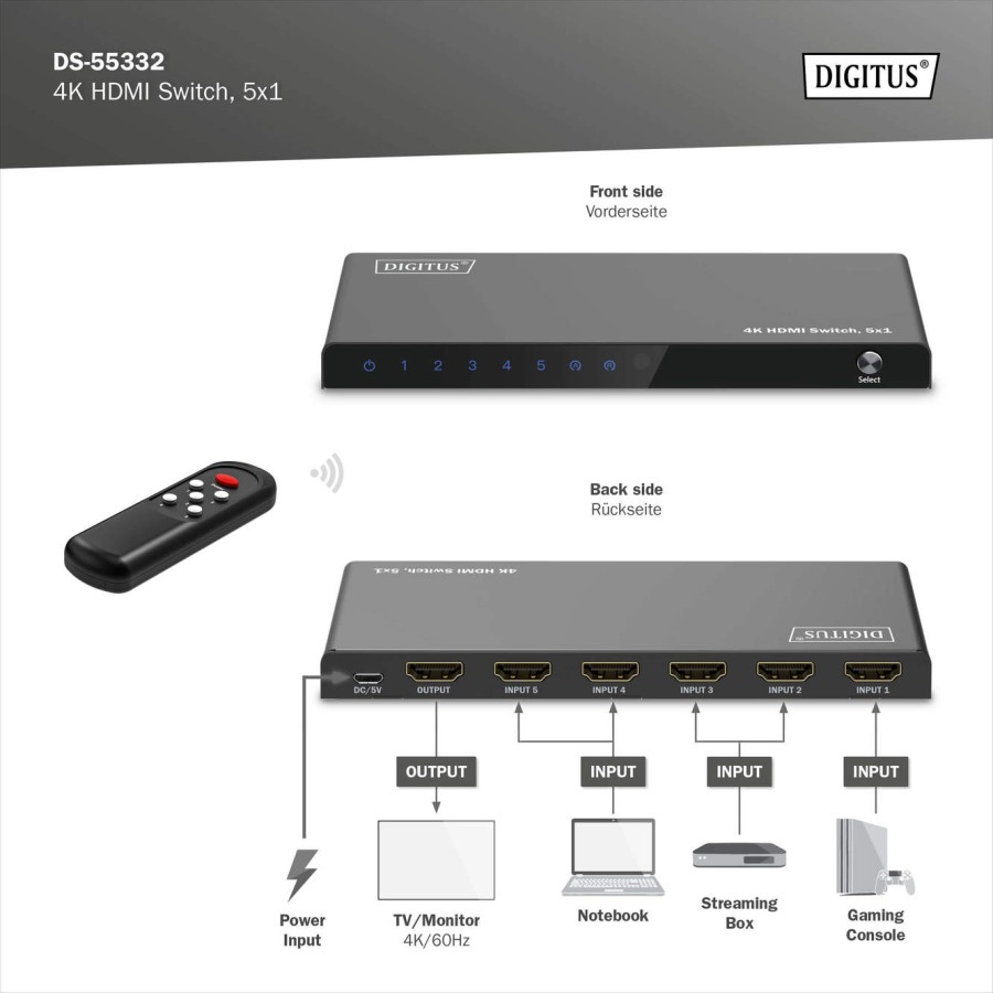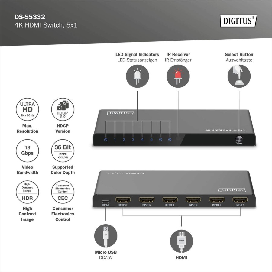 DIGITUS UHD HDMI 5x1 забезпечує підключення до одного дисплея п’яти HDMI-джерел. Перемикання між сигналами можливо за допомогою дистанційного керування, на самому пристрої або автоматично. Підтримує роздільну здатність 4K/60 Гц, HDR, HDCP 2.2 та CEC. Корпус з металу забезпечує надійність, а живлення через Micro USB робить установку зручною та простою.