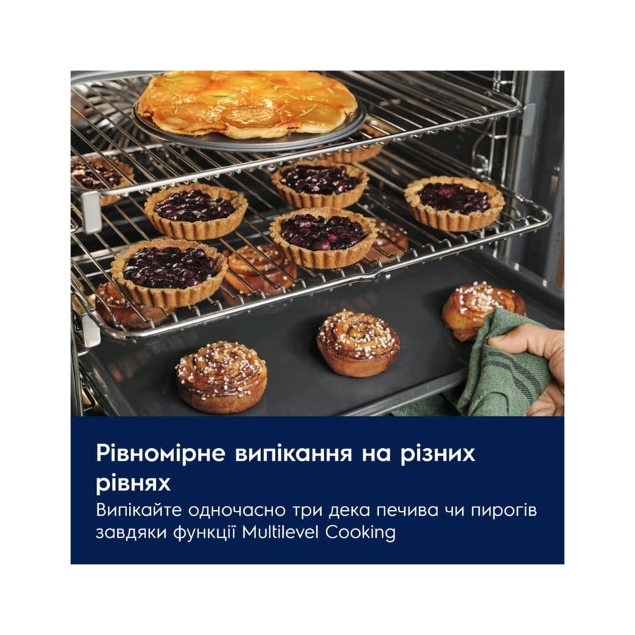 Система Even Cooking та багаторівневе готування забезпечують рівномірний розподіл гарячого повітря. Активується третій нагрівальний елемент, що дає змогу випікати на трьох рівнях одночасно — без ризику пересушування чи неповного пропікання. Функція швидкого нагрівання скорочує час розігріву камери.