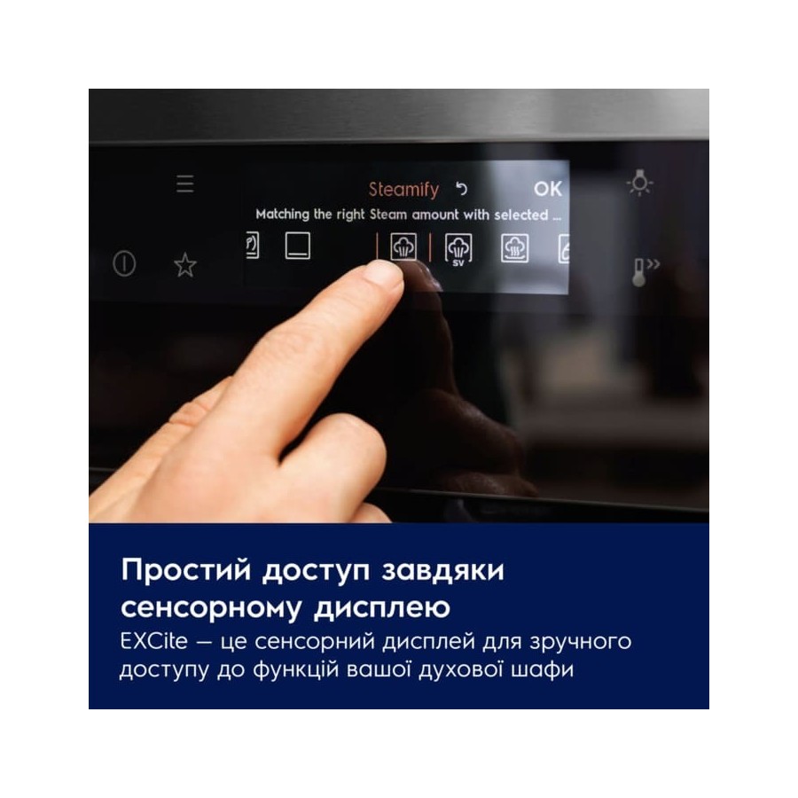 Вбудована духова шафа Electrolux серії MealAssist 700 створена для комфортного та точного приготування. Модель оснащена сенсорним TFT-дисплеєм EXCite, який забезпечує швидкий доступ до всіх функцій та режимів, надає миттєвий зворотний зв’язок і допомагає контролювати кожен етап готування. Інтерфейс підтримує кілька мов, що робить керування ще зручнішим.