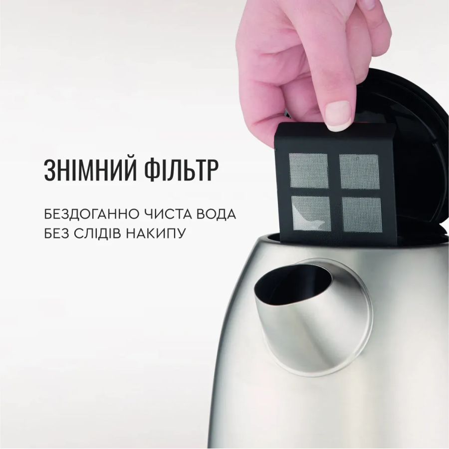 Фільтр-сіточка знімається одним рухом, що забезпечує максимально просте очищення. Завдяки їй, у ваших напоях ніколи не буде частинок накипу.