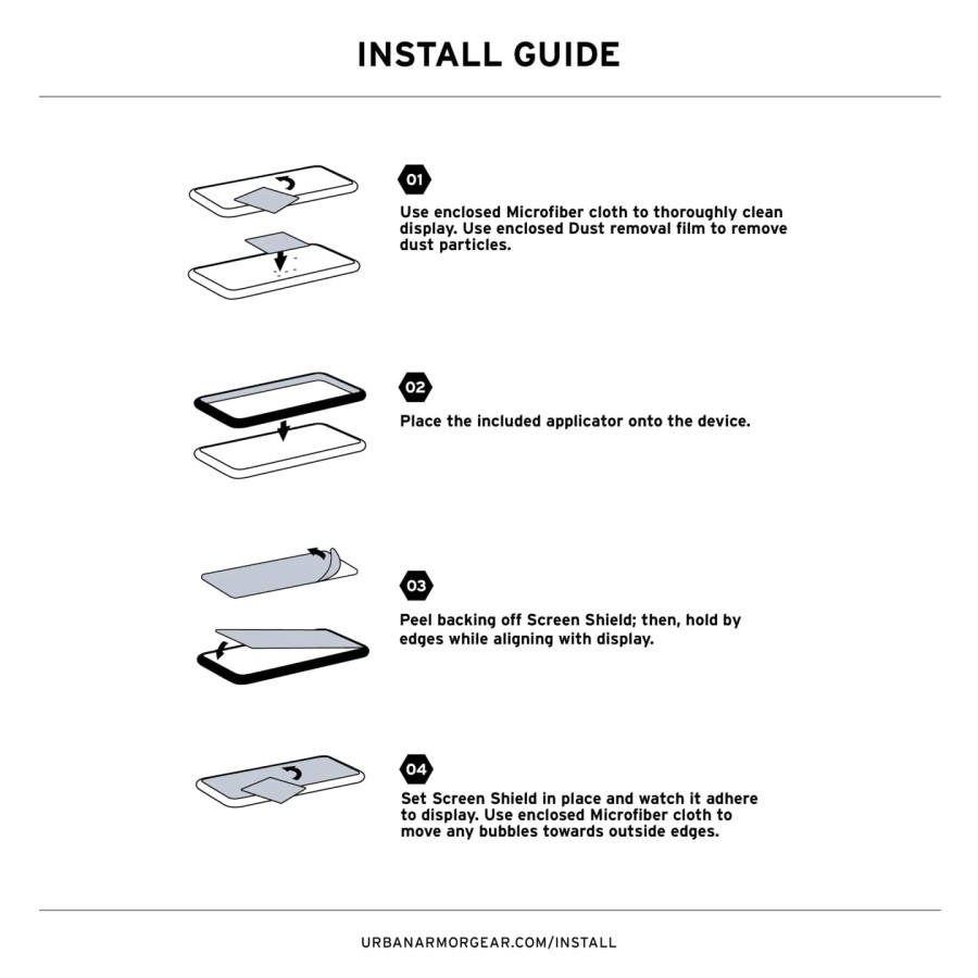 Захисне скло, монтажна рамка, серветка з мікрофібри, волога серветка, наклейка для пилу, інструкція. Виробництво — Китай, бренд — UAG (США). Гарантія — 1 рік.