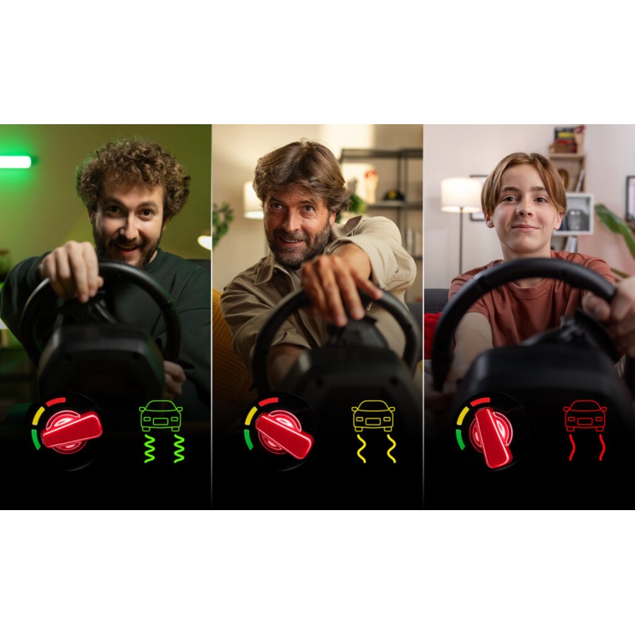 Thrustmaster T98-X Ferrari 296 GTS створено у співпраці з Ferrari та Microsoft, що забезпечує високий рівень реалістичності та сумісності. Копія керма Ferrari 296 GTS у масштабі 7:10 виглядає вишукано, а зручні пелюстки перемикання передач створюють ефект справжнього автомобіля. Система автоцентрування Bungee Cord забезпечує плавний опір, допомагаючи відчути динаміку кожного маневру. У комплект входить педальний блок із двома чутливими педалями, а три попередньо налаштовані профілі дозволяють вибрати стиль керування під власні вподобання.