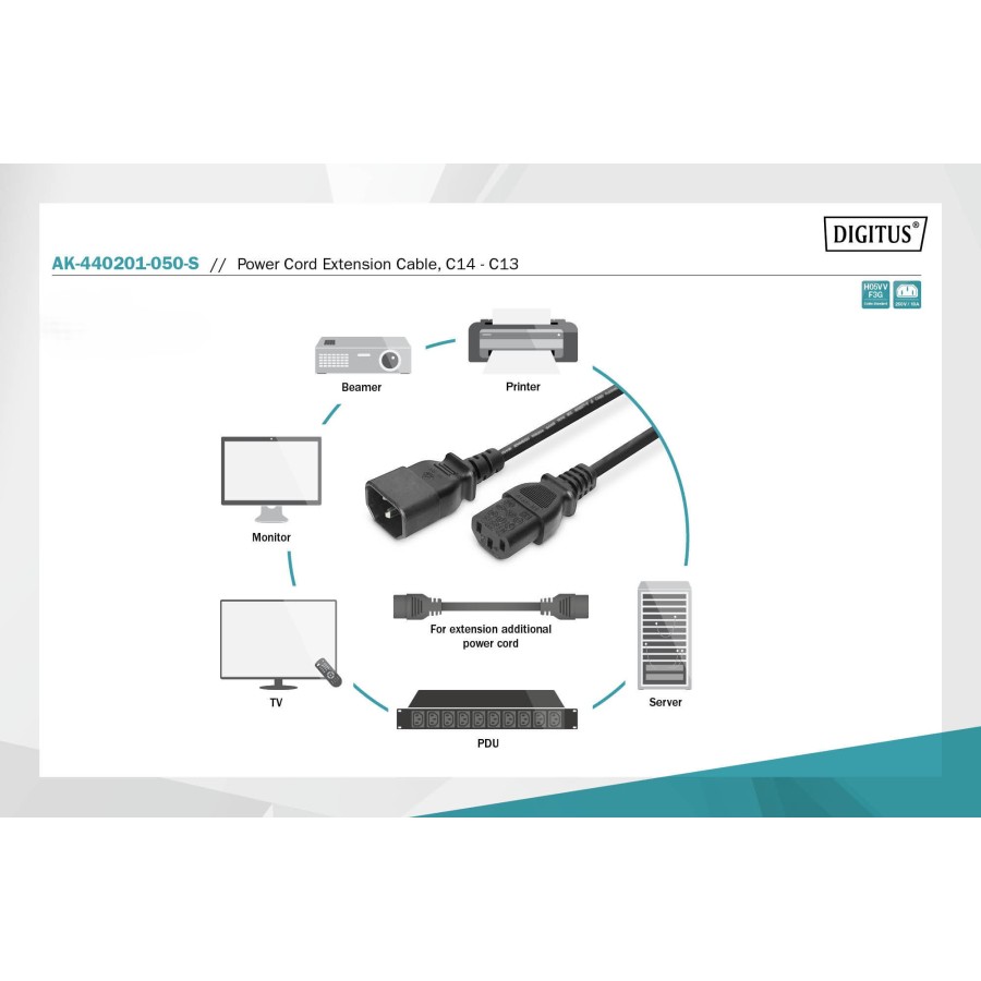 Кабель живлення DIGITUS C14/M - C13/F довжиною 5 метрів призначений для підключення двох моніторів або інших пристроїв до одного блока живлення, що дозволяє зменшити кількість використовуваних мережевих розеток. Також може використовуватись як подовжувач живлення.