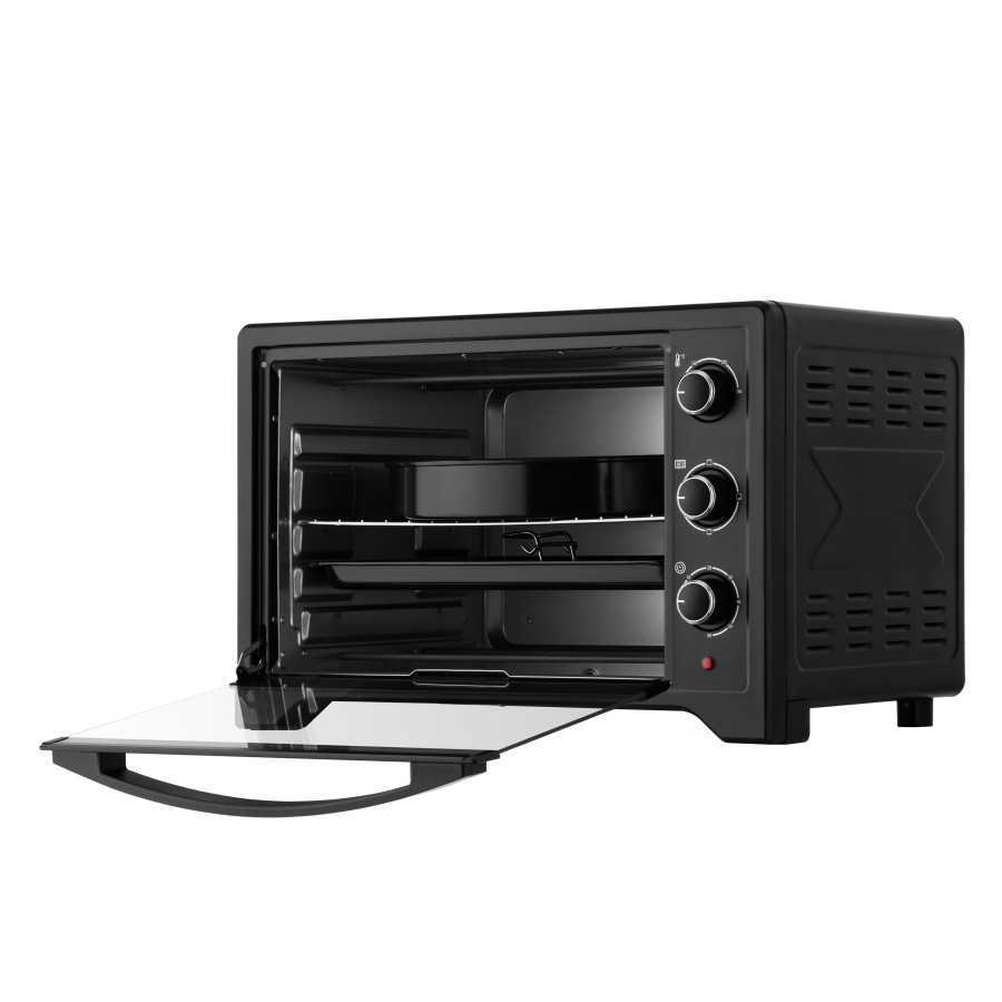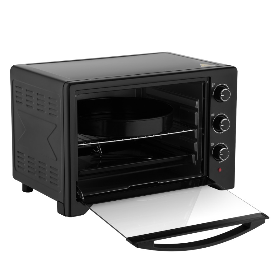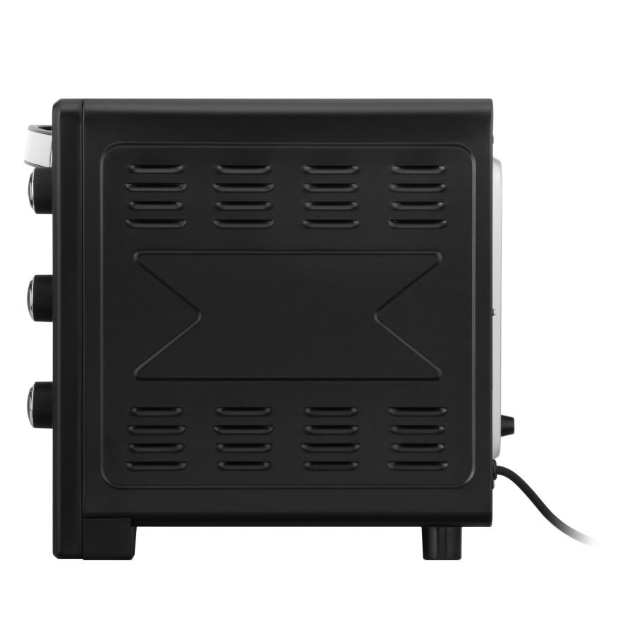 Лаконічний чорний корпус має стильний вигляд, гармонійно доповнюючи кухонний інтер’єр. Дверцята із загартованого скла витримують вплив високої температури, а нековзні ніжки забезпечують стійкість під час використання. Піч компактна, але містка: її розмір – 377 × 549 × 408 мм.