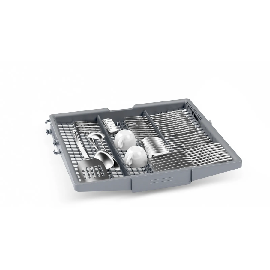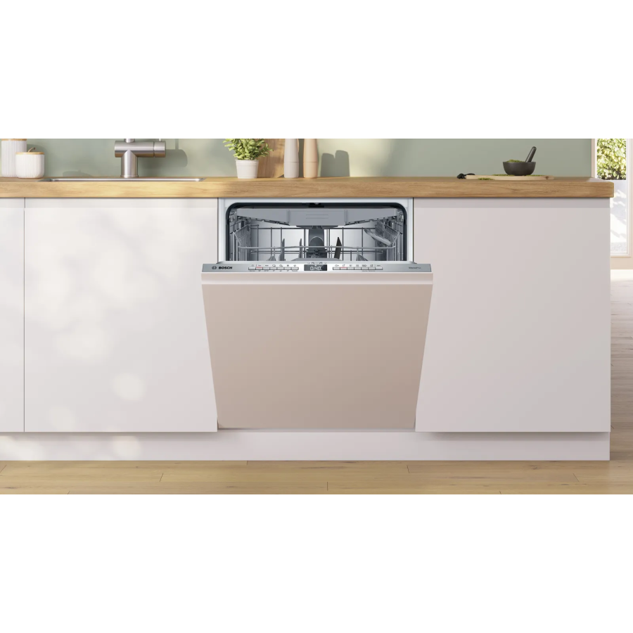 Посудомийна машина Bosch SMH4ECX28E — повністю вбудована модель із петлями VarioHinge, які піднімають фасад під час відкривання. Це дає змогу залишати мінімальні та рівномірні зазори між меблевими елементами, зокрема в кухнях із низьким цоколем або високим монтажем. Для гнучкого завантаження передбачено третій рівень VarioDrawer для столових приборів і дрібного приладдя, а також RackMatic із трьома фіксованими позиціями по висоті — верхній кошик можна переставити на 3 рівні (приблизно ±5 см) одним рухом. Опція ExtraDry підвищує температуру фінального полоскання та збільшує час сушіння — зручно для пластикового та скляного посуду. Застосунок Home Connect показує стан циклу, надсилає push-повідомлення, веде статистику споживання (вода та енергія до 12 місяців) і має Programme Assistant: користувач обирає тип посуду, рівень забруднення та пріоритети (швидкість, сушіння, тиша, економія), а система пропонує оптимальний режим і дозволяє запускати його віддалено. AquaStop забезпечує багаторівневий захист від протікань завдяки шлангу в захисній оболонці, запобіжному клапану та піддону з поплавковим датчиком. Світловий індикатор стану (Status Light) у верхньому лівому куті сигналізує про активність машини та допомагає уникнути передчасного відкривання дверцят.