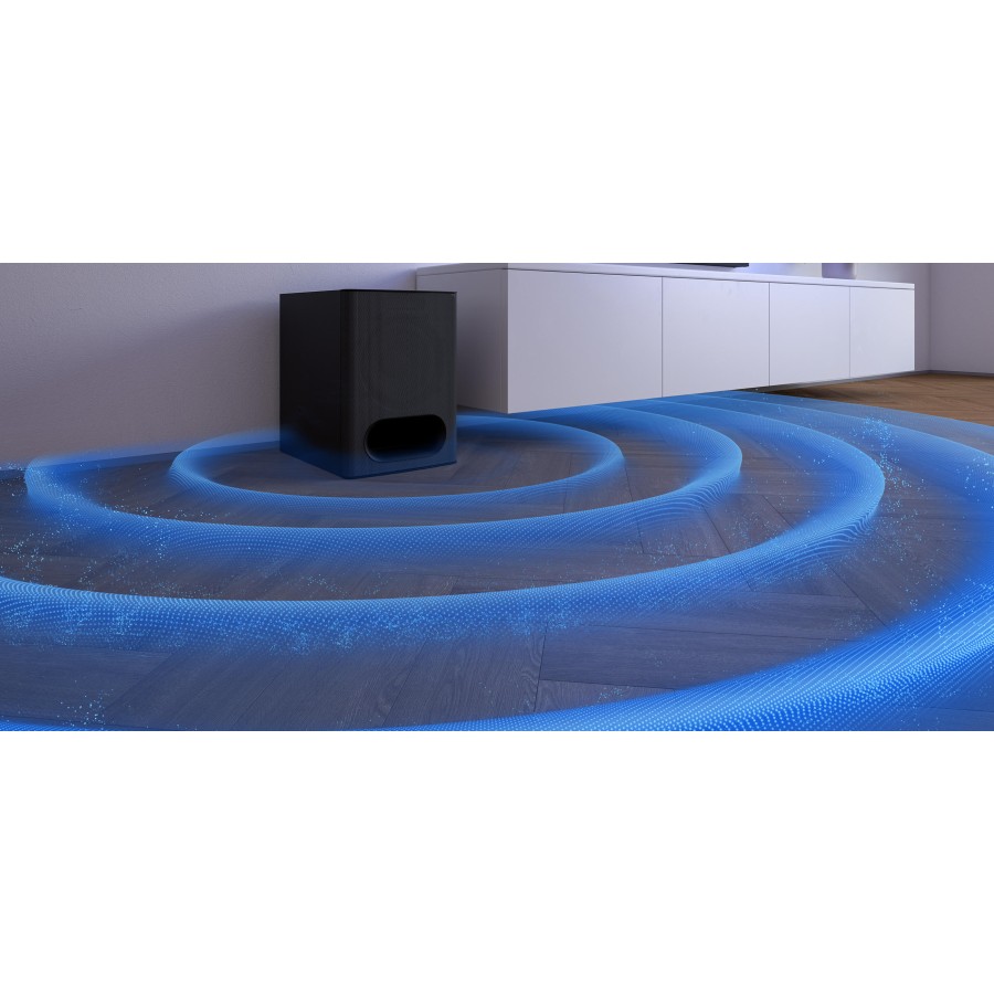 Sony HT-S60 формує кінематографічне оточення завдяки поєднанню реального 5.1-канального звучання й технологій віртуального об’ємного поля. Центральний канал забезпечує чисте відтворення голосу, тоді як сабвуфер додає глибини низьким частотам. Висока роздільна здатність аудіо передає музику та ефекти з вражаючою деталізацією. Завдяки компактній формі система гармонійно пасує до телевізора й не займає багато місця.