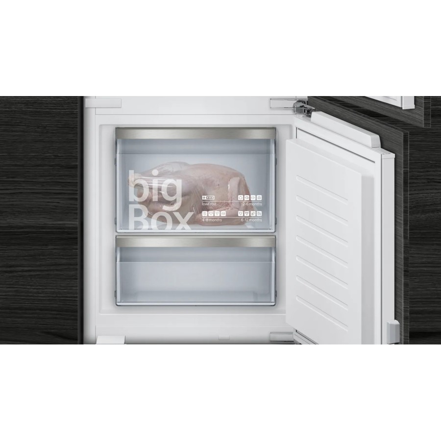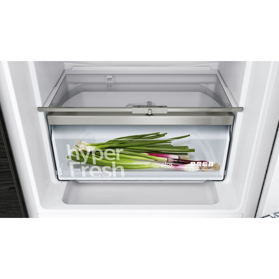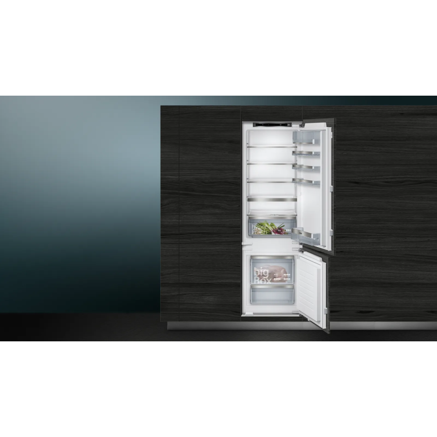 Вбудований холодильник Siemens серії iQ500 розрахований на щоденне використання в сучасній кухні з інтегрованою технікою. Завдяки нижньому розміщенню морозильної камери основний простір відведено під холодильне відділення, де розміщені скляні полиці та зона свіжості для овочів і фруктів.