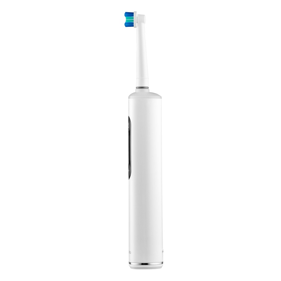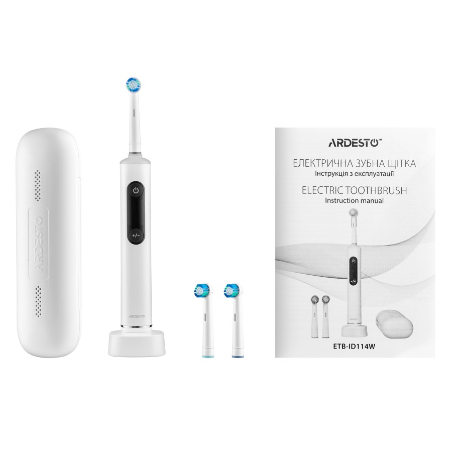 Електрична зубна щітка ARDESTO працює зі швидкістю 6 800–10 000 об./хв і підтримує п’ять режимів чищення з п’ятьма рівнями інтенсивності. Щетинки DuPont і Pedex середньої жорсткості ефективно видаляють наліт, а їх знебарвлення слугує індикатором зношування насадки. Модель оснащено LCD-дисплеєм, смарттаймером, функцією пам’яті, сенсором надмірного натискання і кольоровою світловою індикацією. Акумулятор 800 мА·год забезпечує до 90 хв автономної роботи, що еквівалентно понад трьом тижням використання (двічі на день по 2 хв). Заряджання здійснюється в бездротовий спосіб. У комплекті: три насадки, індуктивна зарядна база з USB-кабелем, захисний ковпачок і дорожній футляр.