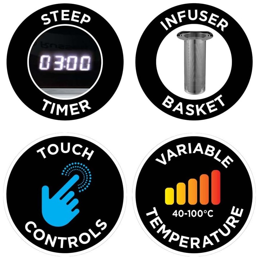 Функція змінної температури дає змогу зупинити нагрівання води за будь-якої температури від 40°C до 100°C відповідно до ваших вимог. Це означає, що можна приготувати особливий чай, не зіпсувавши його тонкого смаку, акуратно підігріти дитячу пляшечку або довести до "червоного розжарювання", щоб приготувати міцний чай або каву.