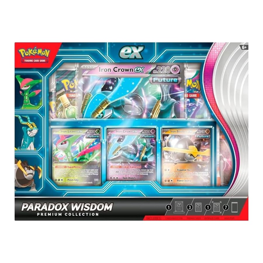Pokémon TCG: Paradox Wisdom Premium Collection — це набір, який об’єднує колекційні та ігрові елементи для шанувальників Pokémon TCG. У його складі — три промокарти з покемонами Iron Leaves ex, Iron Crown ex та Iron Boulder ex, кожна з яких може стати ключовим елементом колоди чи колекції. Також додано велику промокарту Iron Crown ex для демонстрації та зберігання.