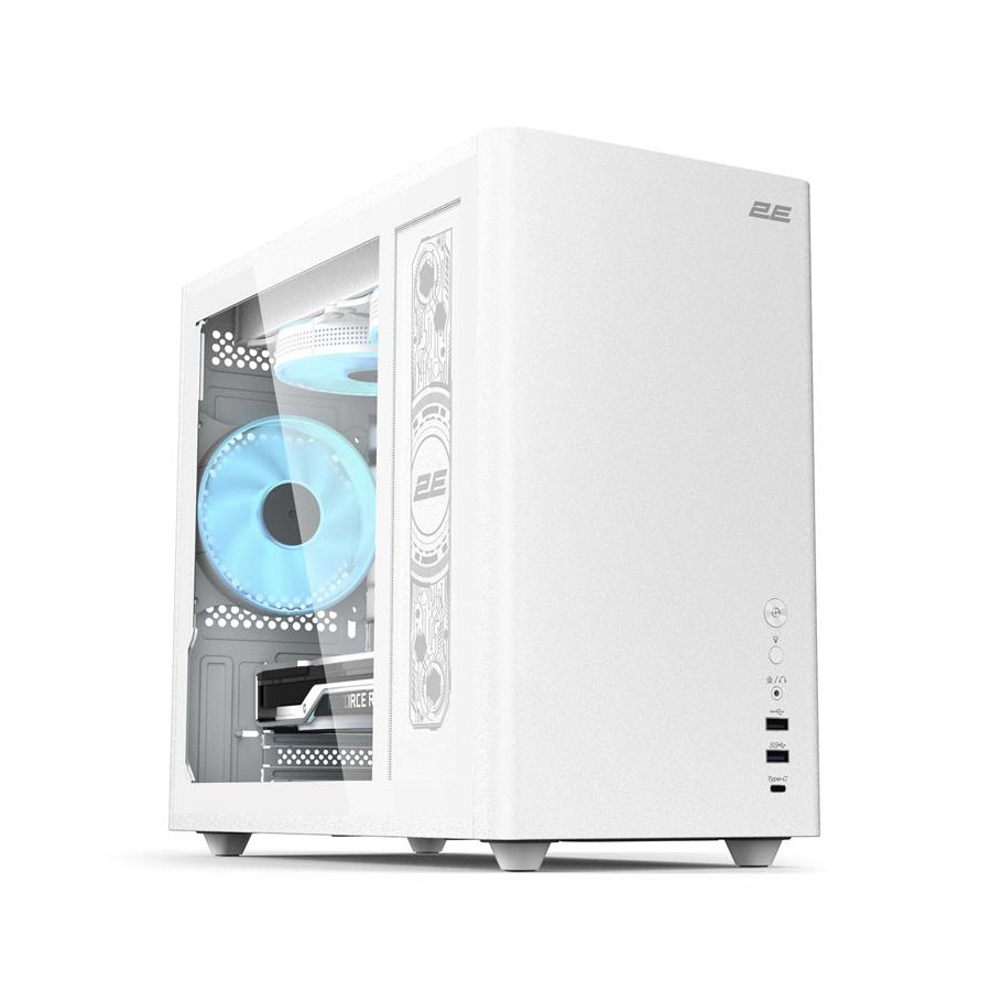 У корпусі встановлено 3х120мм ARGB вентилятори (2E-ACF120VB-ARGB) на верххній та на задній панелях. Можливо встановити двох секційну систем рідинного охолодження (240мм) на верхню панель. Для підключення, керування та контролю за комп'ютерною периферією в арсеналі корпусу є роз'єми 1xUSB3.0, 1х USB 2.0, 1xUSB Type-C, HD AUDIO+MIC, кнопки та індикатори Power, LED, HDD LED, що розташовані на передній панелі. Це зручно в процесі експлуатації.