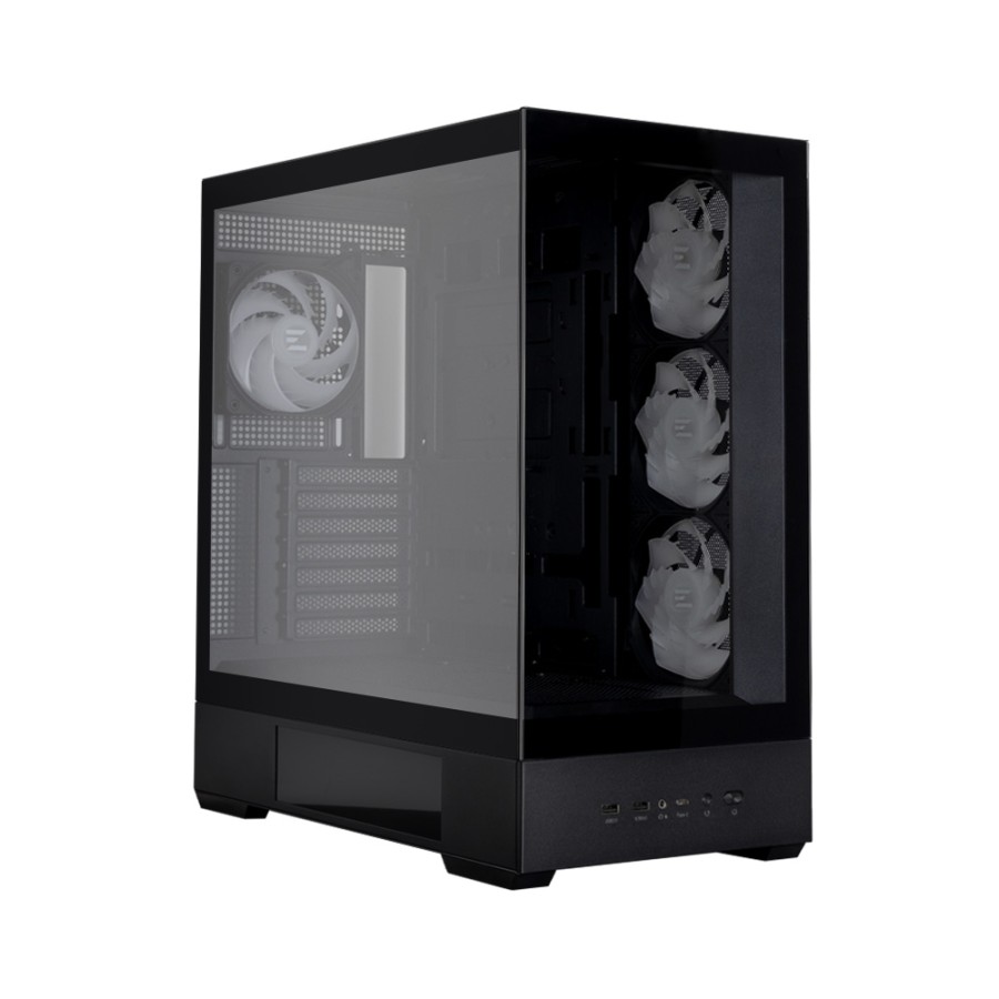 Передня та бічна панелі – загартоване скло зі зручним та практичним безгвинтовим кріпленням. Прозорий панорамний корпус підкреслює візуальний ефект вентиляторів ARGB і виглядає стильно.