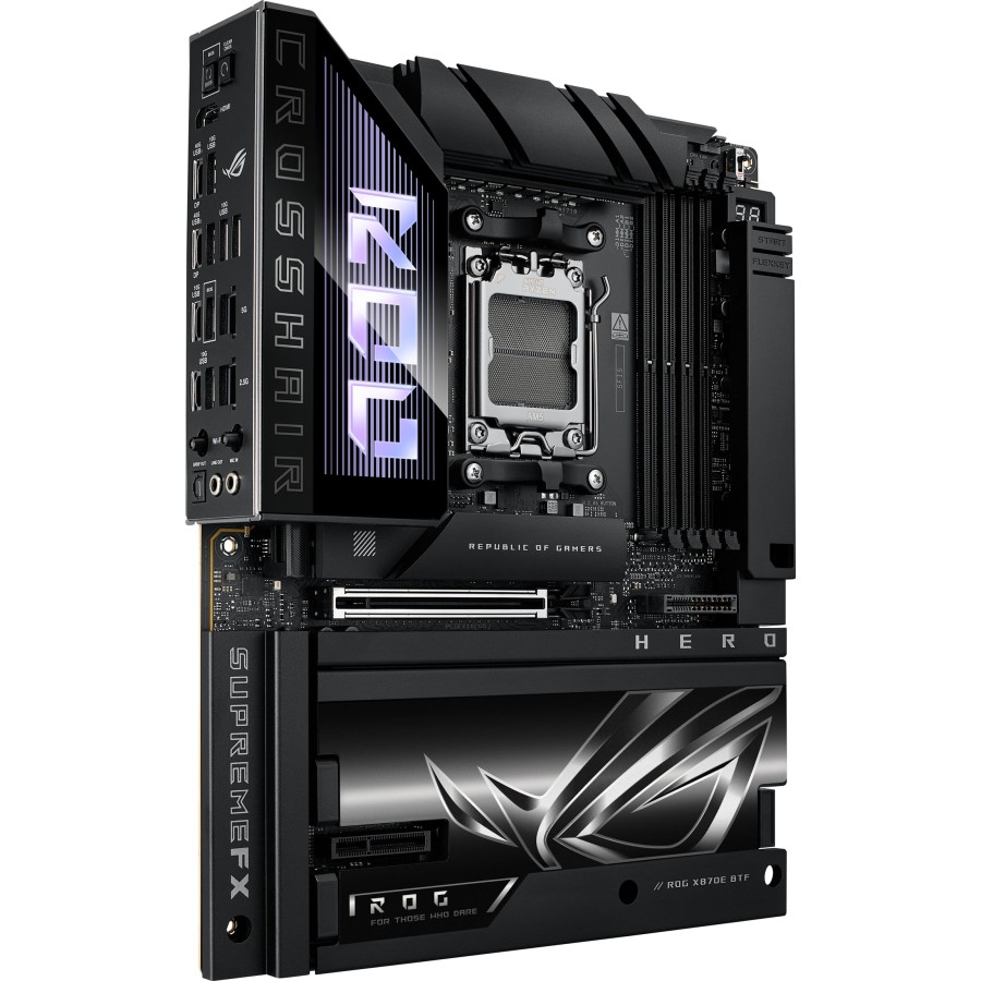 ROG Crosshair X870E Hero BTF поєднує високотехнологічну архітектуру з новим форматом BTF (Back-To-Future), у якому всі розніми живлення, USB і вентиляторів розташовані зі зворотного боку плати. Це рішення забезпечує бездоганну чистоту збірки та полегшує керування кабелями. Плата оснащена системою живлення Extreme Engine Digi+ (18 фаз), підтримує PCIe 5.0, DDR5 до 8600+ МТ/с, п’ять слотів M.2, Wi-Fi 7 та Bluetooth 5.4.