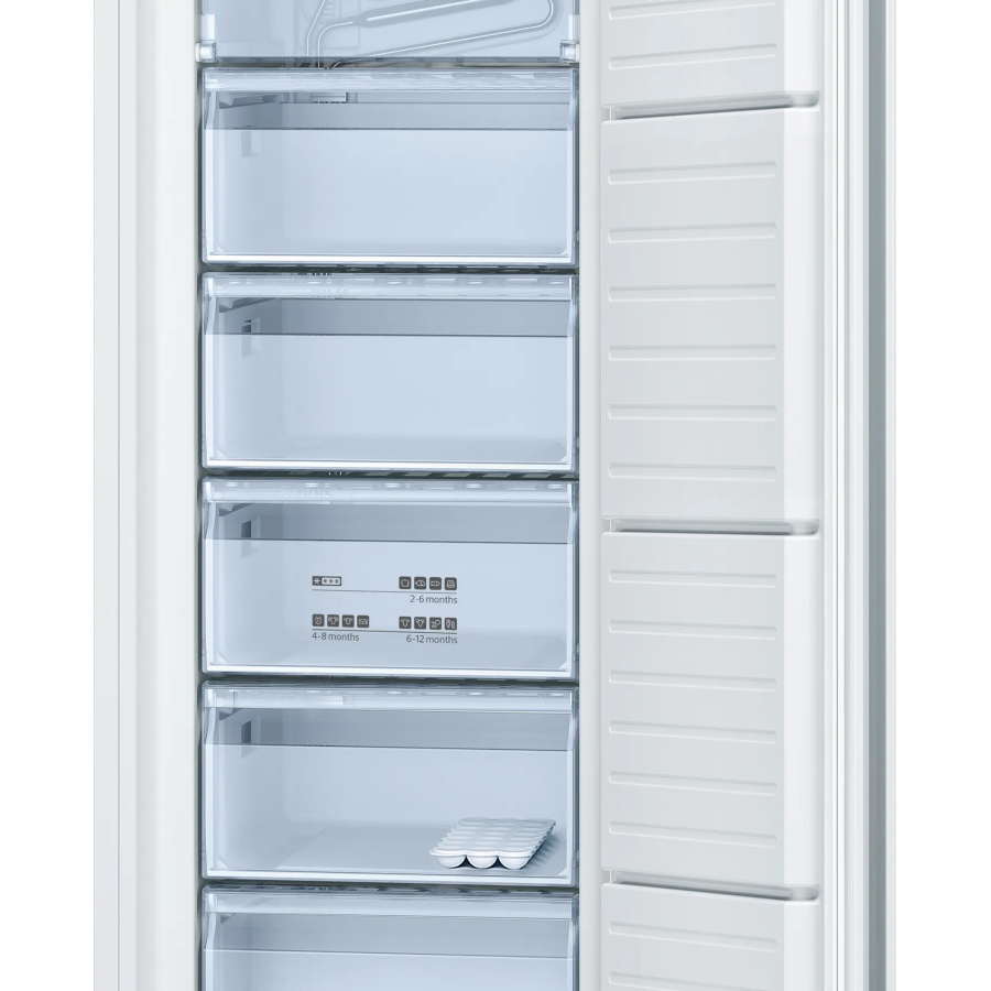Морозильна камера Bosch GSV24VWE0N — це окремовстановлювана модель серії 4 з об’ємом 182 л для раціонального зберігання заморожених продуктів. Вона поєднує енергоефективність класу E, низький рівень шуму 42 дБ та продуману ергономіку з п’ятьма висувними ящиками й додатковим відділенням із кришкою.