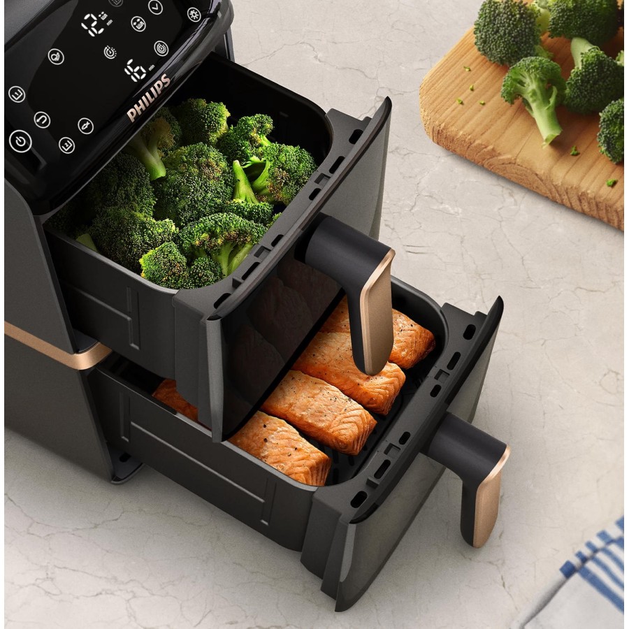 Мультипіч Philips Stacked Dual поєднує високу потужність 2300 Вт і місткість 10 літрів у компактному корпусі. Завдяки двом окремим кошикам по 5 л можна готувати дві різні страви одночасно, а система синхронізації завершує обидва процеси одночасно. Технологія RapidAir забезпечує рівномірне приготування та золотисту скоринку, а керамічне антипригарне покриття полегшує очищення. Сенсорна панель дозволяє обрати одну з 6 автоматичних програм або налаштувати параметри вручну.