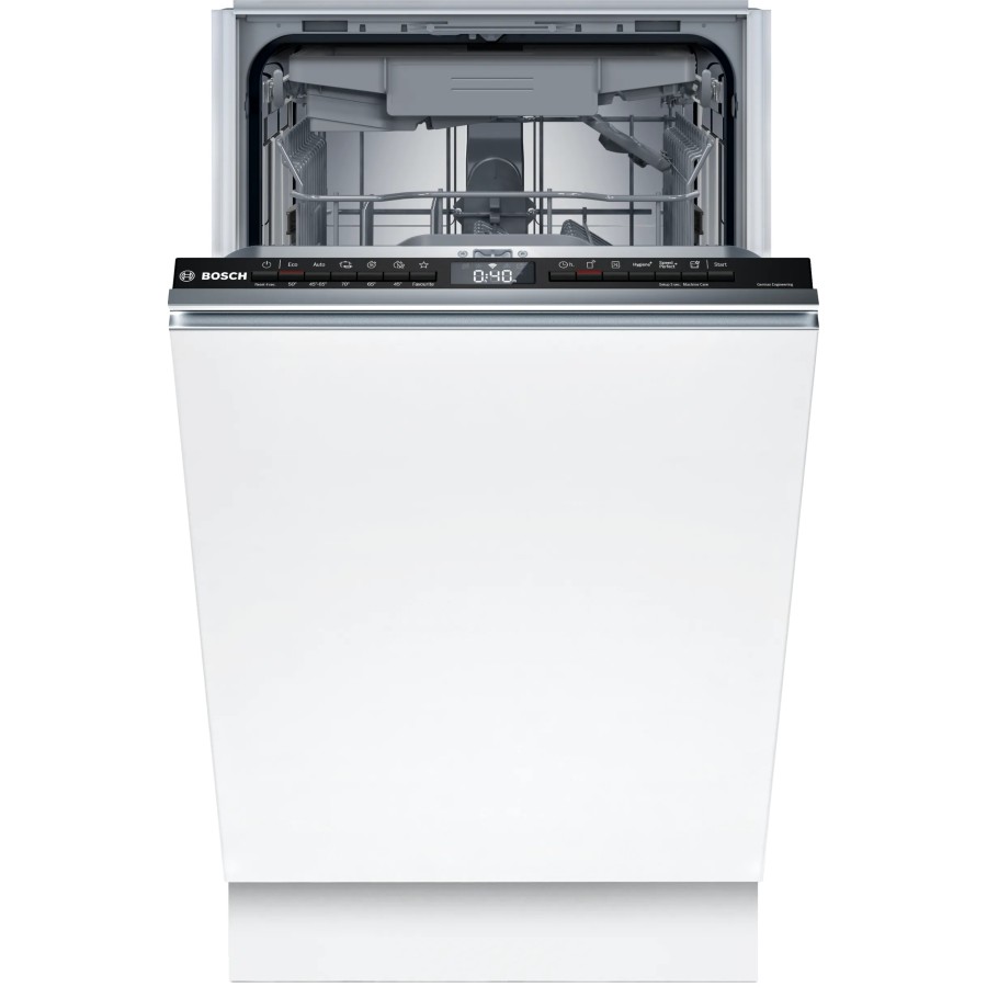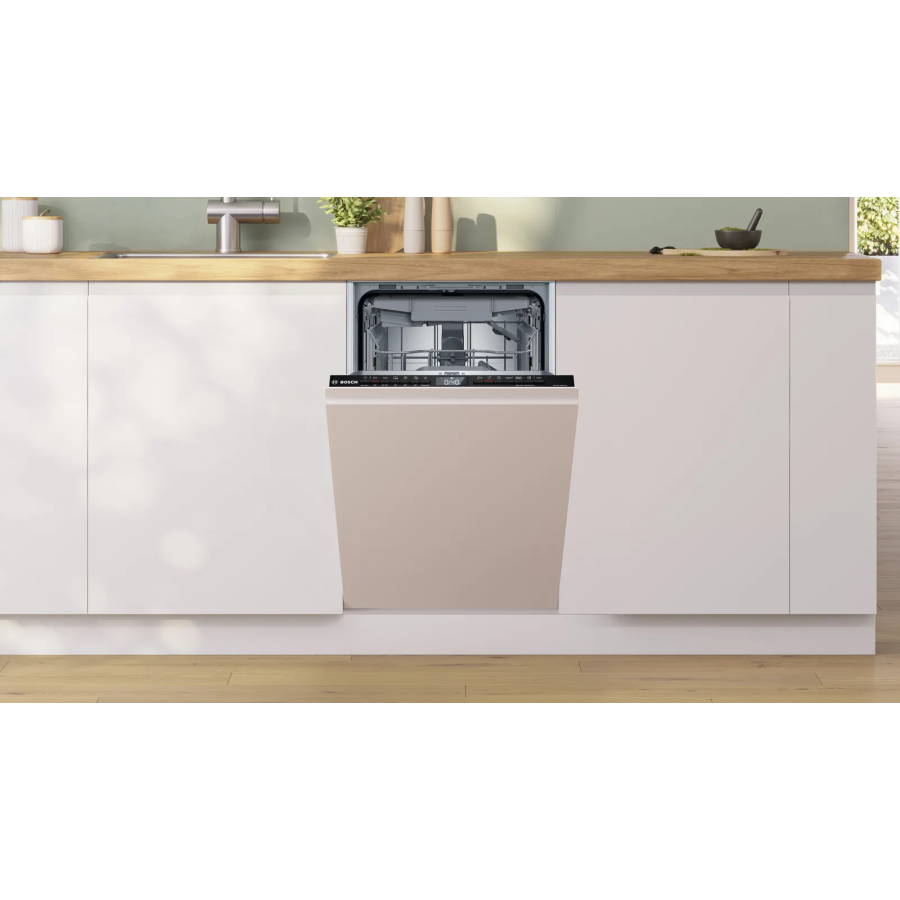 Посудомийна машина SPV4HMX14Q — повністю вбудована модель із розумними сервісами Home Connect. У застосунку можна запускати та призупиняти програму, обирати параметри, стежити за станом циклу й переглядати дані про сіль, ополіскувач і жорсткість води. Функції «Улюблене» та Easy Start спрощують щоденне користування: зберігайте потрібні комбінації або отримуйте рекомендації програми після коротких відповідей про тип і кількість посуду та рівень забруднення. Опція SpeedPerfect+ скорочує час миття (залежно від обраної програми та моменту активації) — увімкнути можна з панелі або в застосунку навіть після старту. Режим Silence on demand через Home Connect тимчасово знижує шум. Система Heat Exchanger попередньо підігріває воду в окремому контурі, мінімізуючи перепади температур під час ополіскування — корисно для келихів і крихкого фарфору. Активований Self Cleaning Filter промиває фільтр вбудованою форсункою після основного миття, проміжного етапу та ополіскувань, тож ручне чищення потрібне значно рідше. Стопори нижнього короба стабілізують рух і запобігають сходженню з рейок.