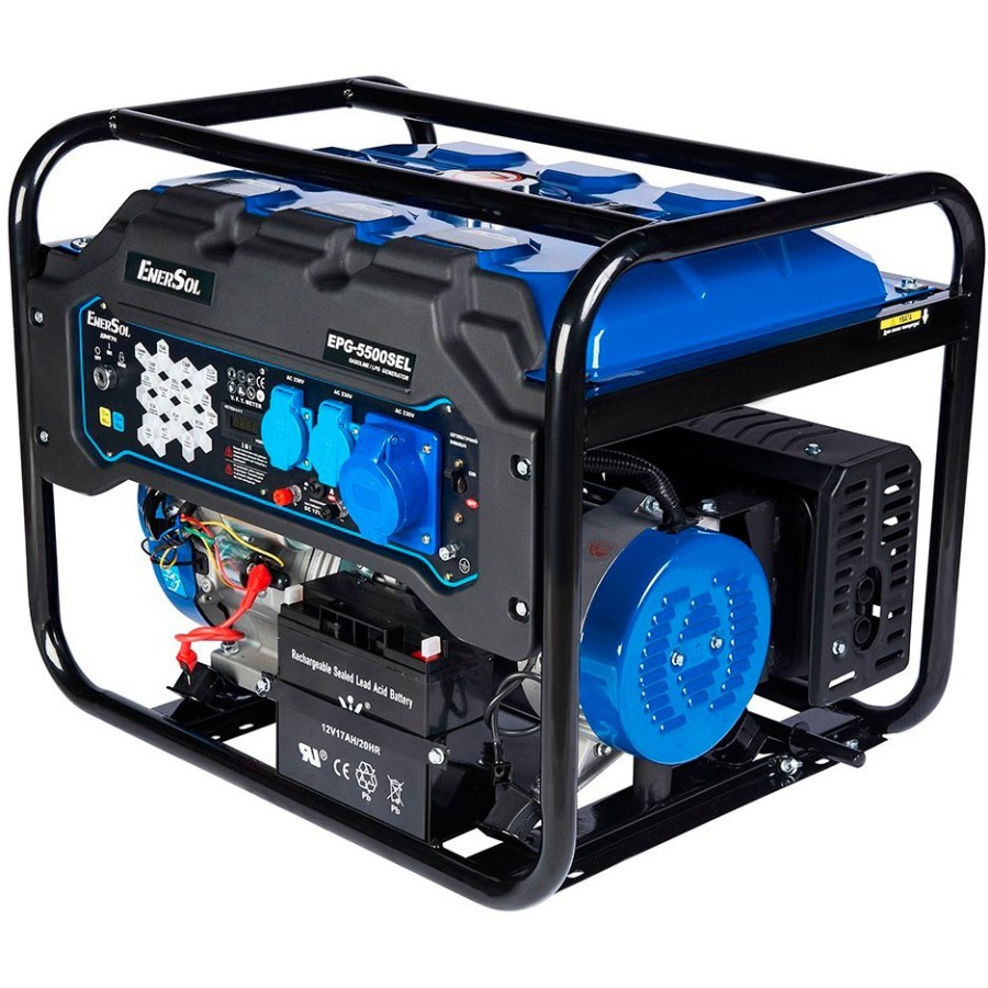 Однофазний переносний газо-бензиновий генератор EnerSol EPG-5500SEL - потужне та надійне джерело енергії, з комбінованою паливною системою, що працює на пропан-бутані та бензині АІ-92 або 95. Міні-електростанція характеризується робочою потужністю 5 кВт (пікова - 5.5 кВт), обладнаний цифровим мультиметром, функцією стабілізації напруги, що робить його ідеальним для використання в якості резервного джерела живлення для чутливої сучасної електронної техніки
