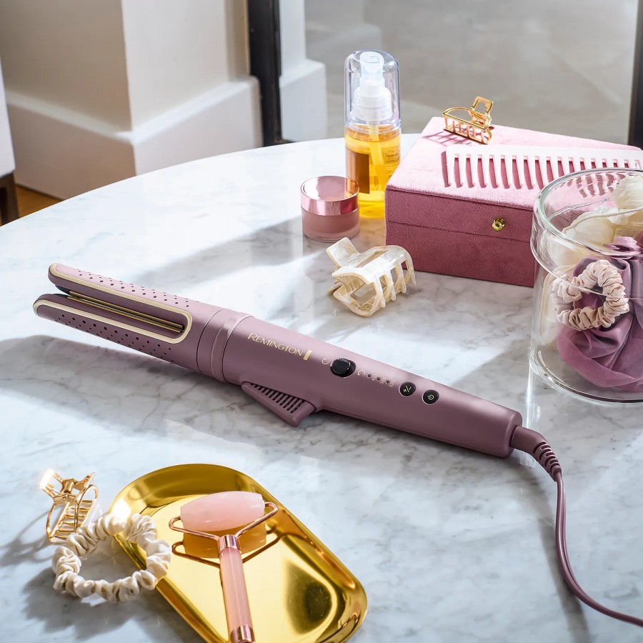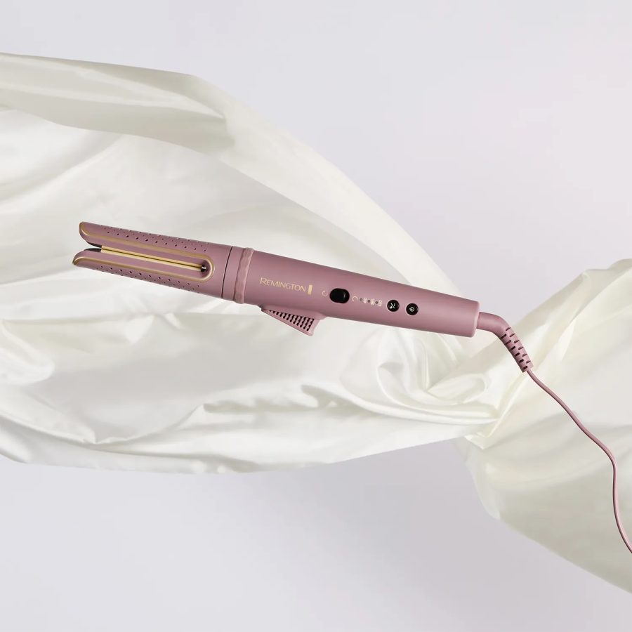Випрямляч Remington AIRvive із обертовим стволом, створений для формування локонів і хвиль із більш керованим процесом укладання. Конструкція розділеного ствола з керамічними пластинами дає змогу протягувати пасмо через стайлер без різких рухів зап’ястям. Щоб сформувати завиток, достатньо розмістити пасмо між пластинами, використати важіль обертання для встановлення потрібного кута та плавно провести прилад уздовж волосся.