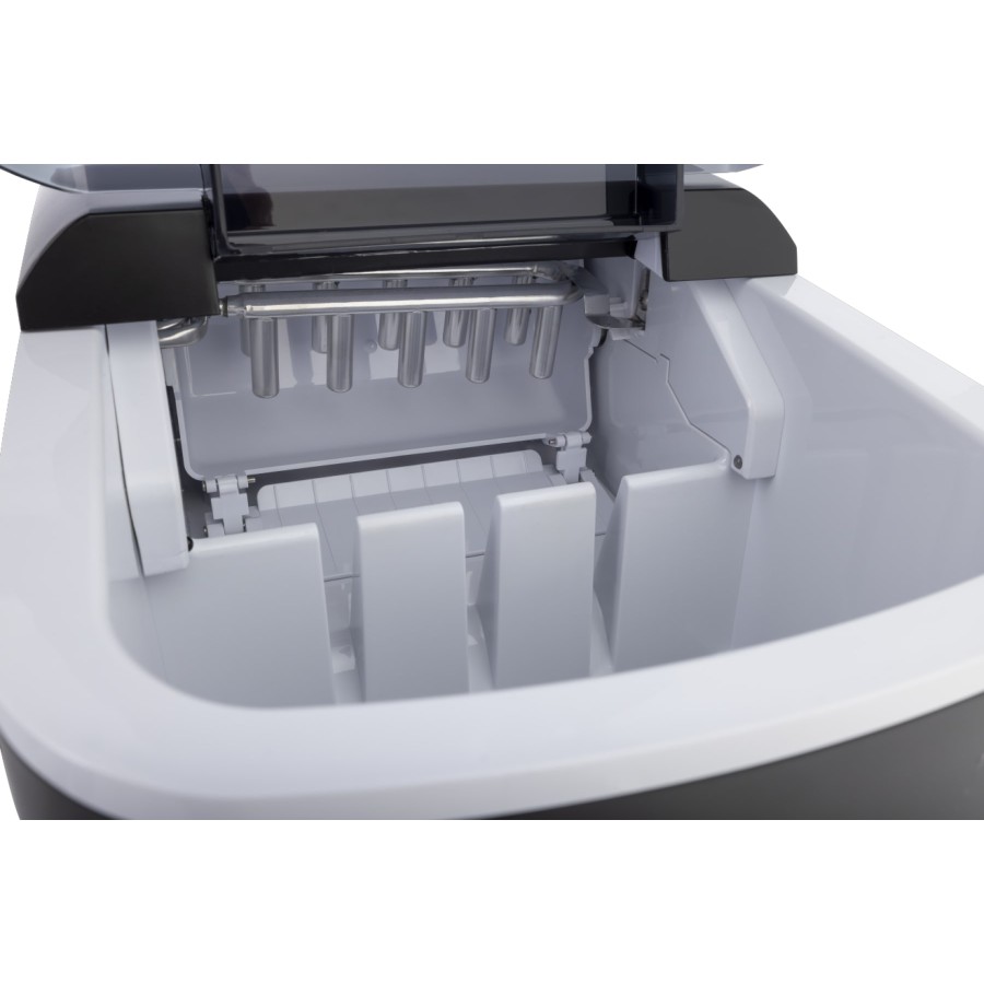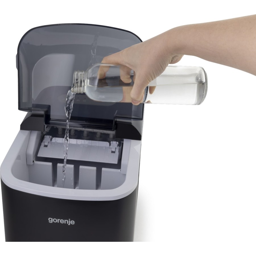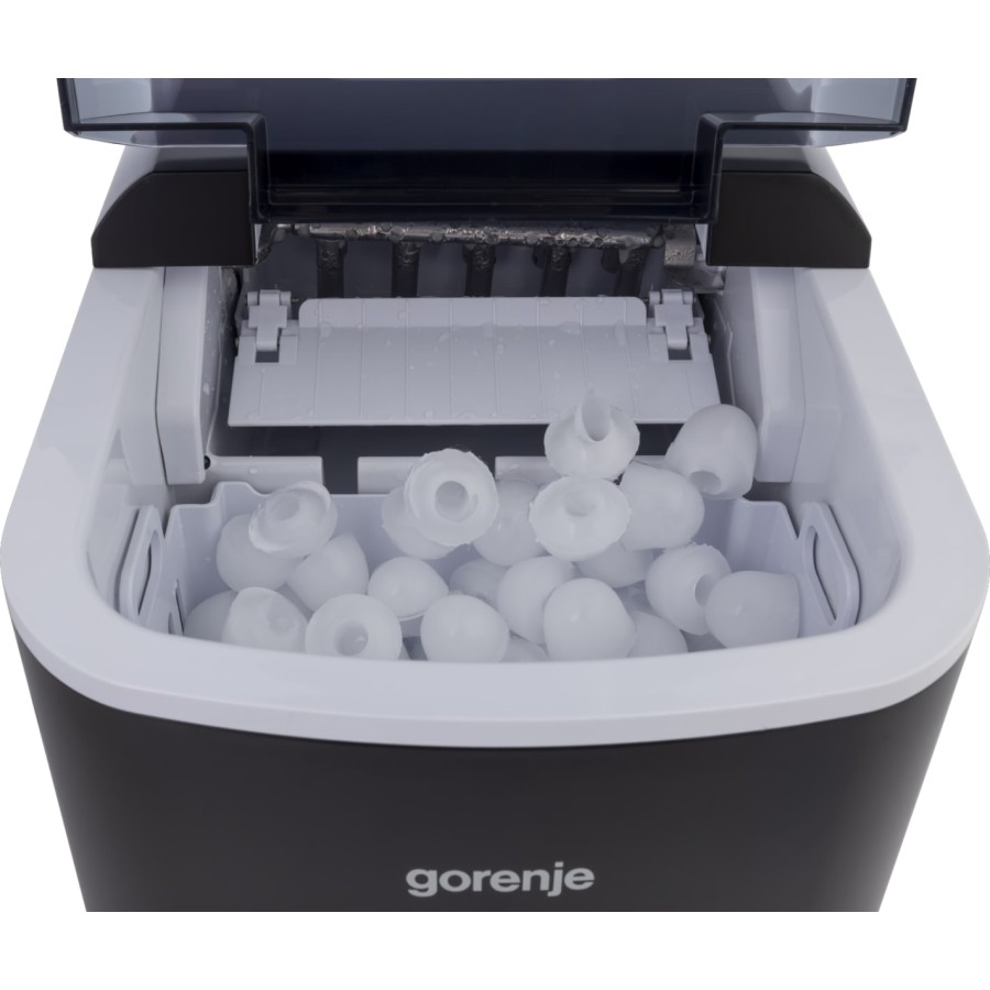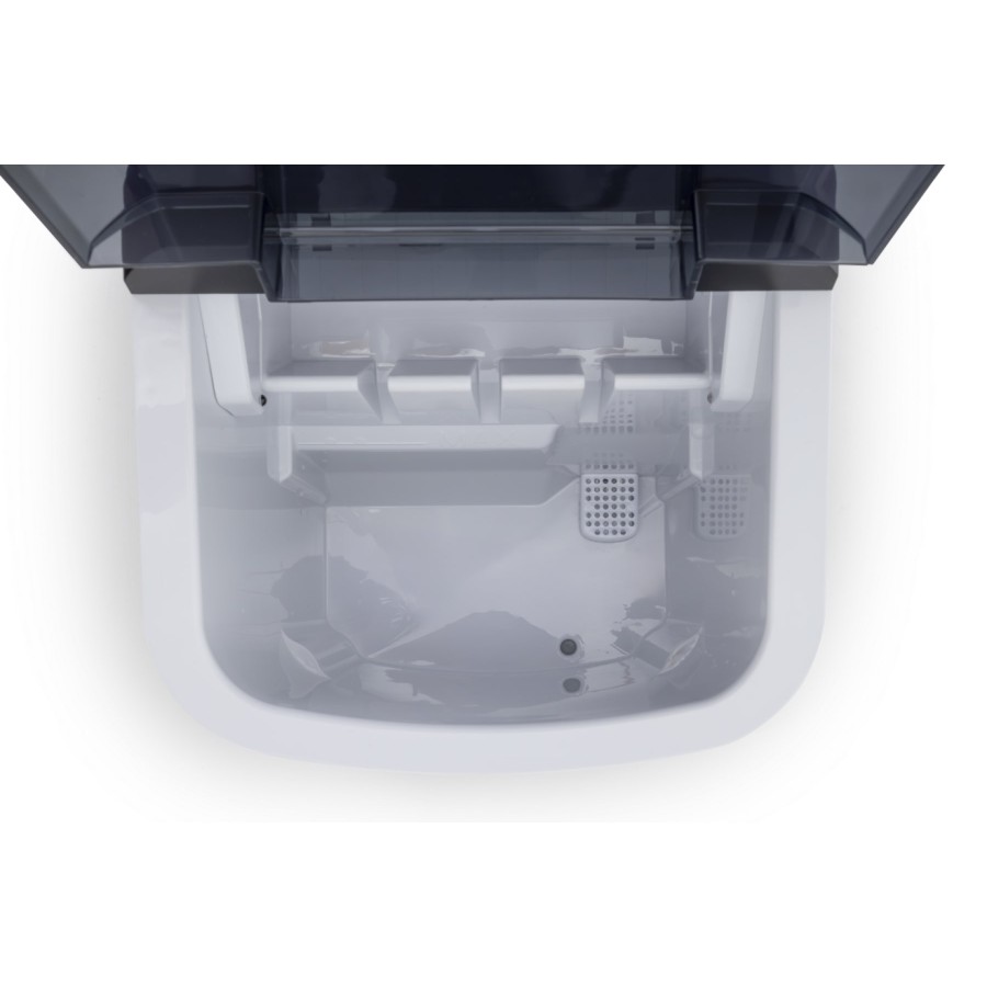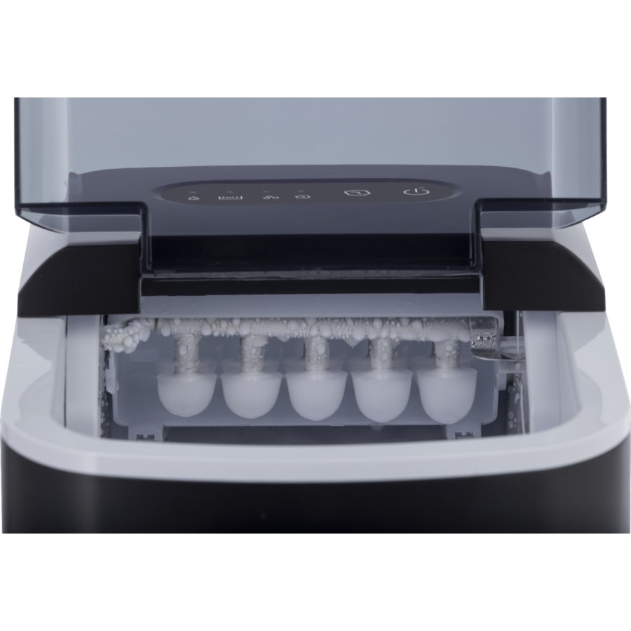Резервуар для води вміщує до 2,1 літра. Індикатори рівня води та льоду повідомлять, коли потрібно поповнити бак або спорожнити корзину. Льодогенератор легко чиститься — зливний отвір внизу дозволяє зручно видалити залишки води, після чого достатньо протерти внутрішню частину сухою тканиною.